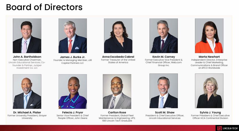 Board of Directors  John A. Bartholdson  Non-Executive Chairman, Lincoln Educational Services; Co-  founder & Partner, Juniper Investment Co. LLC  James J. Burke Jr.  Founder & Managing Member, JJB Capital Partners LLC  Anna Escobedo Cabral Former Treasurer of the United States of America  Kevin M. Carney Former Executive Vice President & Chief Financial Officer, Web.com  Group Inc.  Marta Newhart Independent Director, Enterprise Leader & Chief Marketing,  Communications & Brand Officer at APCO Worldwide  Dr. Michael A. Plater  Former University President, Strayer University  Felecia J. Pryor  Senior Vice President & Chief People Officer, John Deere  Carlton Rose  Former President, Global Fleet Maintenance & Engineering, UPS; 1981 Lincoln Tech Graduate  Scott M. Shaw  President & Chief Executive Officer, Lincoln Educational Services  Sylvia J. Young  Former President & Chief Executive Officer HCA Continental Division