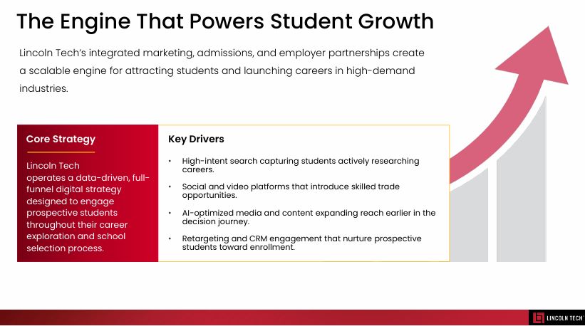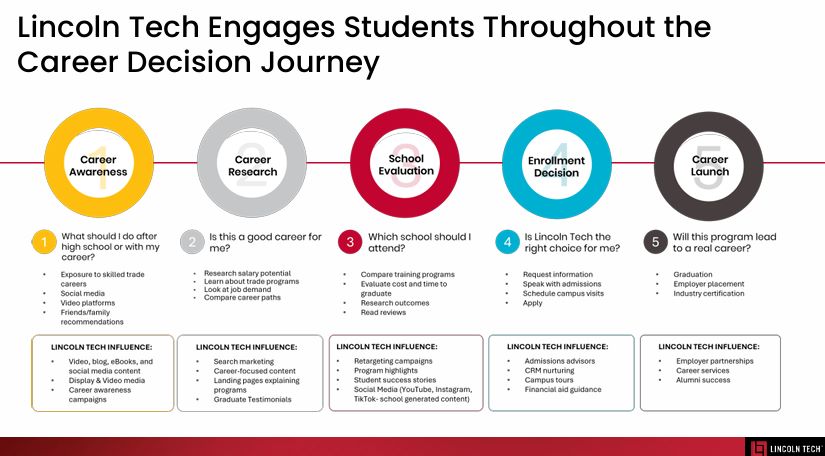 The Engine That Powers Student Growth  Lincoln Tech’s integrated marketing, admissions, and employer partnerships create a scalable engine for attracting students and launching careers in high-demand industries.  Core Strategy  Key Drivers  High-intent search capturing students actively researching careers.  Social and video platforms that introduce skilled trade opportunities.  AI-optimized media and content expanding reach earlier in the decision journey.  Retargeting and CRM engagement that nurture prospective students toward enrollment.  Lincoln Tech  operates a data-driven, full-funnel digital strategy  designed to engage prospective students throughout their career exploration and school selection process.