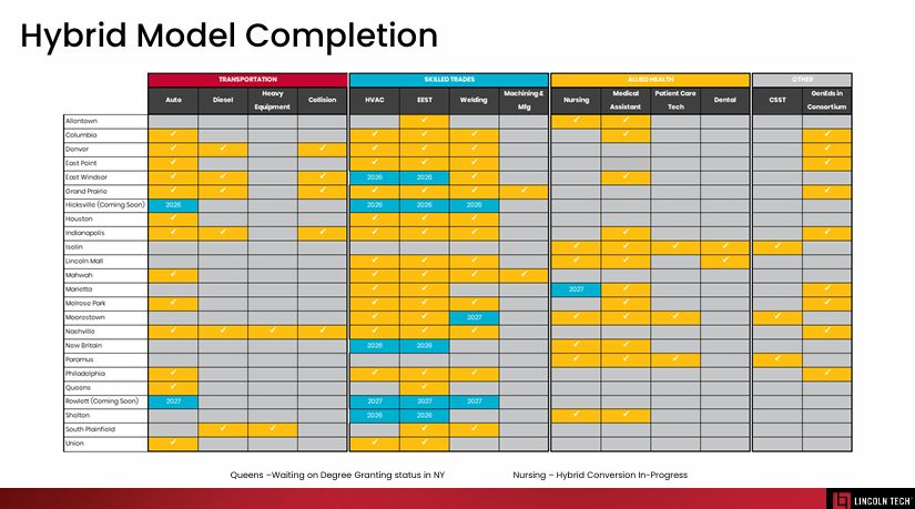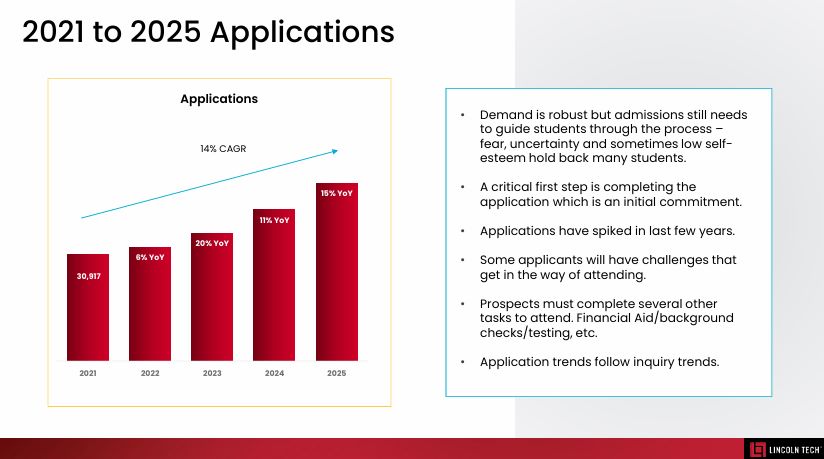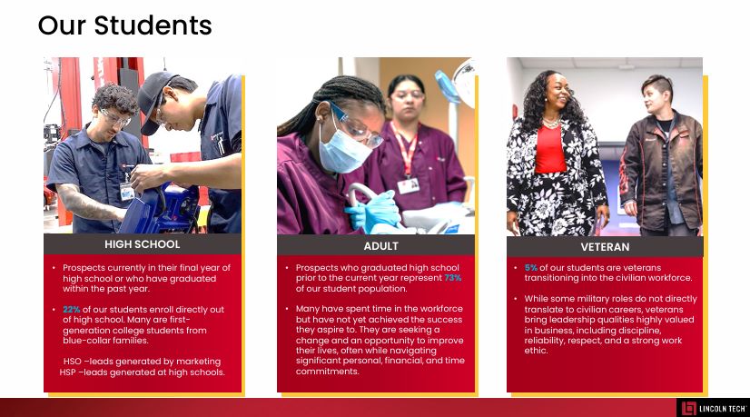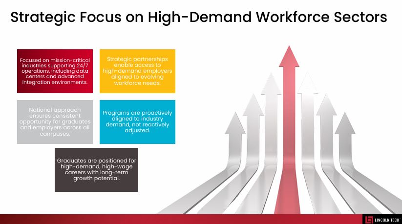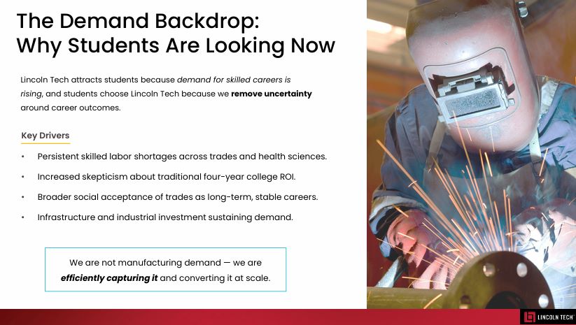The Demand Backdrop:  Why Students Are Looking Now  Lincoln Tech attracts students because demand for skilled careers is rising, and students choose Lincoln Tech because we remove uncertainty around career outcomes.  Key Drivers  Persistent skilled labor shortages across trades and health sciences.  Increased skepticism about traditional four-year college ROI.  Broader social acceptance of trades as long-term, stable careers.  Infrastructure and industrial investment sustaining demand.  We are not manufacturing demand — we are  efficiently capturing it and converting it at scale.