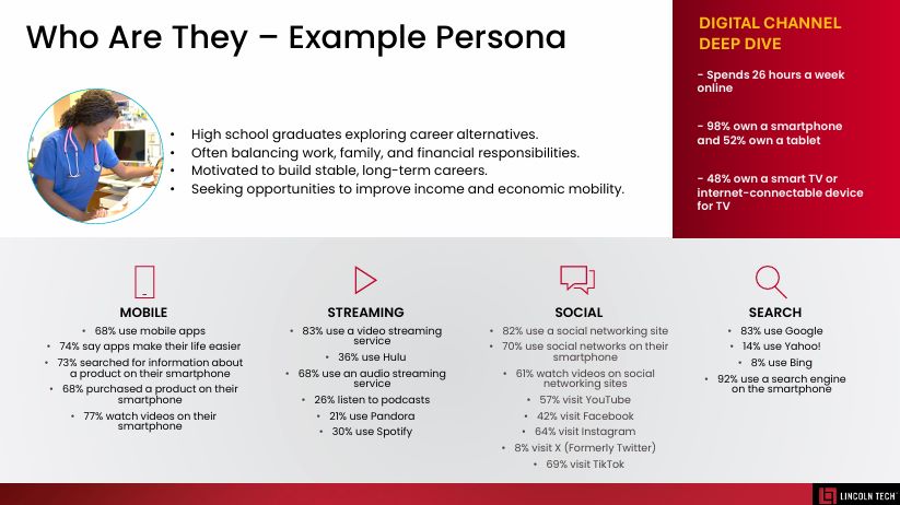 Who Are They – Example Persona  High school graduates exploring career alternatives.  Often balancing work, family, and financial responsibilities.  Motivated to build stable, long-term careers.  Seeking opportunities to improve income and economic mobility.  SOCIAL  82% use a social networking site  70% use social networks on their  smartphone  61% watch videos on social networking sites  57% visit YouTube  42% visit Facebook  64% visit Instagram  8% visit X (Formerly Twitter)  69% visit TikTok  SEARCH  83% use Google  14% use Yahoo!  8% use Bing  92% use a search engine on the smartphone  MOBILE  68% use mobile apps  74% say apps make their life easier  73% searched for information about a product on their smartphone  68% purchased a product on their  smartphone  77% watch videos on their  smartphone  STREAMING  83% use a video streaming  service  36% use Hulu  68% use an audio streaming  service  26% listen to podcasts  21% use Pandora  30% use Spotify  DIGITAL CHANNEL DEEP DIVE  - Spends 26 hours a week online  - 98% own a smartphone and 52% own a tablet  - 48% own a smart TV or internet-connectable device for TV