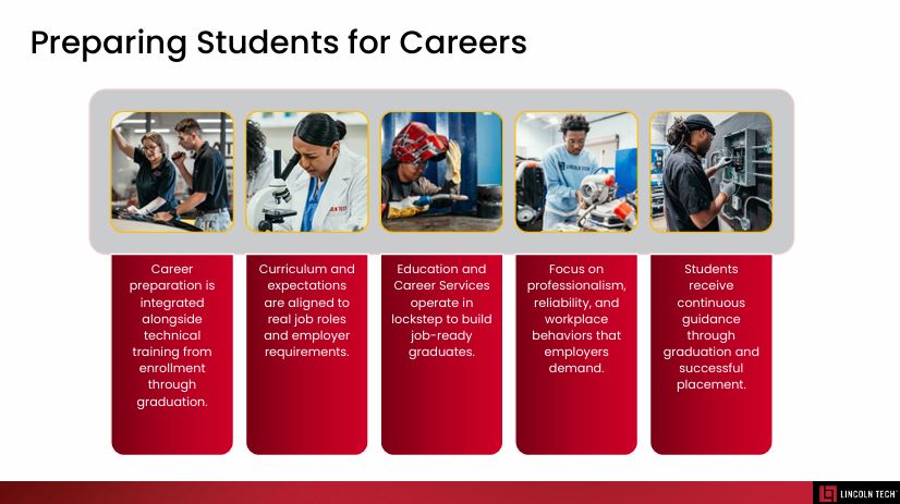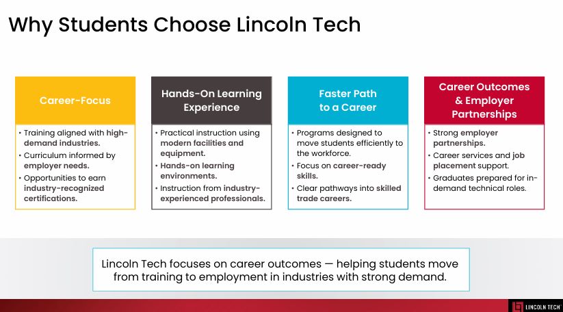 Why Students Choose Lincoln Tech  Career-Focus  Training aligned with high-demand industries.  Curriculum informed by  employer needs.  Opportunities to earn industry-recognized certifications.  Hands-On Learning Experience  Practical instruction using modern facilities and equipment.  Hands-on learning environments.  Instruction from industry-experienced professionals.  Faster Path to a Career  Programs designed to move students efficiently to the workforce.  Focus on career-ready skills.  Clear pathways into skilled trade careers.  Career Outcomes & Employer Partnerships  Strong employer partnerships.  Career services and job placement support.  Graduates prepared for in-demand technical roles.  Lincoln Tech focuses on career outcomes — helping students move from training to employment in industries with strong demand.