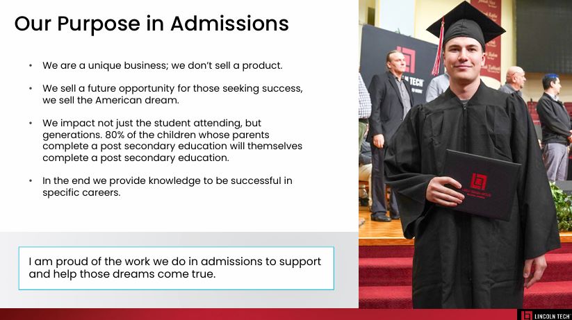 Our Purpose in Admissions  We are a unique business; we don’t sell a product.  We sell a future opportunity for those seeking success, we sell the American dream.  We impact not just the student attending, but generations. 80% of the children whose parents complete a post secondary education will themselves complete a post secondary education.  In the end we provide knowledge to be successful in specific careers.  I am proud of the work we do in admissions to support and help those dreams come true.