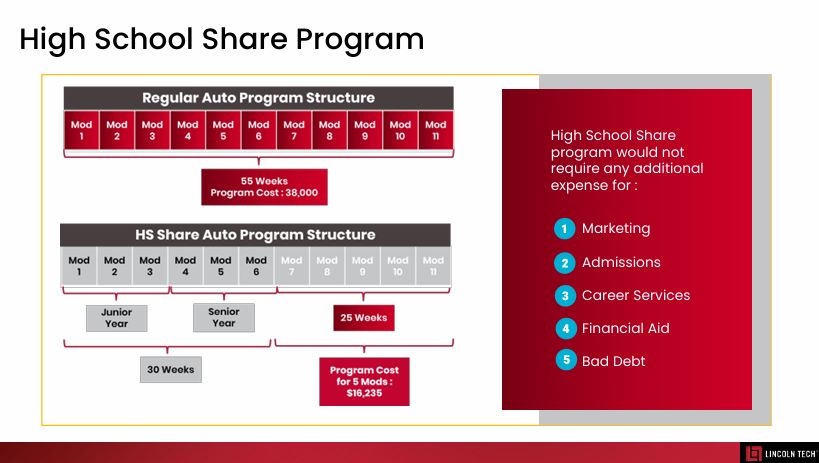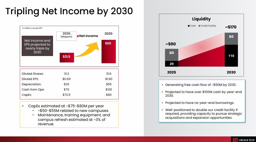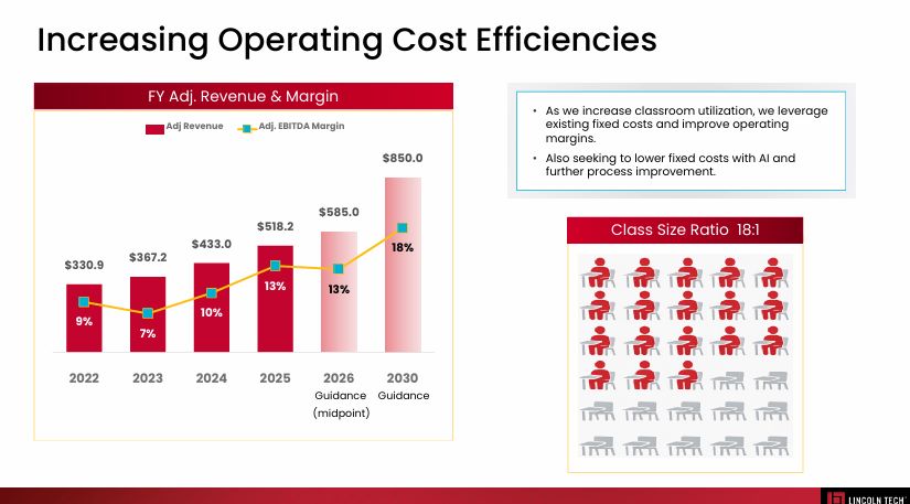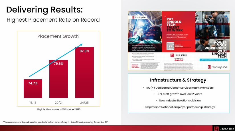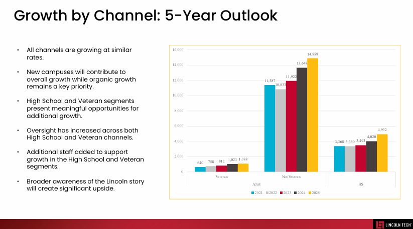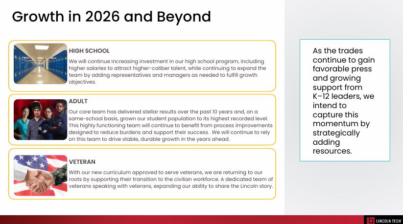 Growth in 2026 and Beyond  HIGH SCHOOL  We will continue increasing investment in our high school program, including higher salaries to attract higher-caliber talent, while continuing to expand the team by adding representatives and managers as needed to fulfill growth objectives.  ADULT  Our core team has delivered stellar results over the past 10 years and, on a same-school basis, grown our student population to its highest recorded level. This highly functioning team will continue to benefit from process improvements designed to reduce burdens and support their success. We will continue to rely on this team to drive stable, durable growth in the years ahead.  VETERAN  With our new curriculum approved to serve veterans, we are returning to our roots by supporting their transition to the civilian workforce. A dedicated team of veterans speaking with veterans, expanding our ability to share the Lincoln story.  As the trades continue to gain favorable press and growing support from  K–12 leaders, we intend to capture this momentum by strategically adding resources.