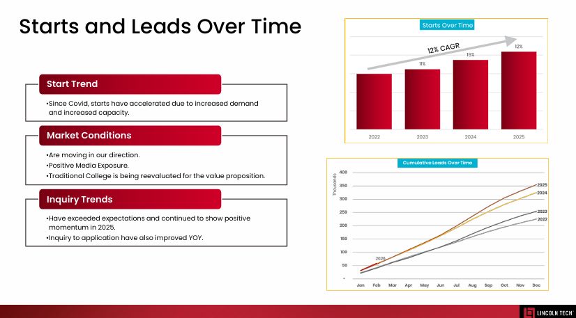 Starts and Leads Over Time  Start Trend  Since Covid, starts have accelerated due to increased demand and increased capacity.  Market Conditions  Are moving in our direction.  Positive Media Exposure.  Traditional College is being reevaluated for the value proposition.  Inquiry Trends  Have exceeded expectations and continued to show positive momentum in 2025.  Inquiry to application have also improved YOY.