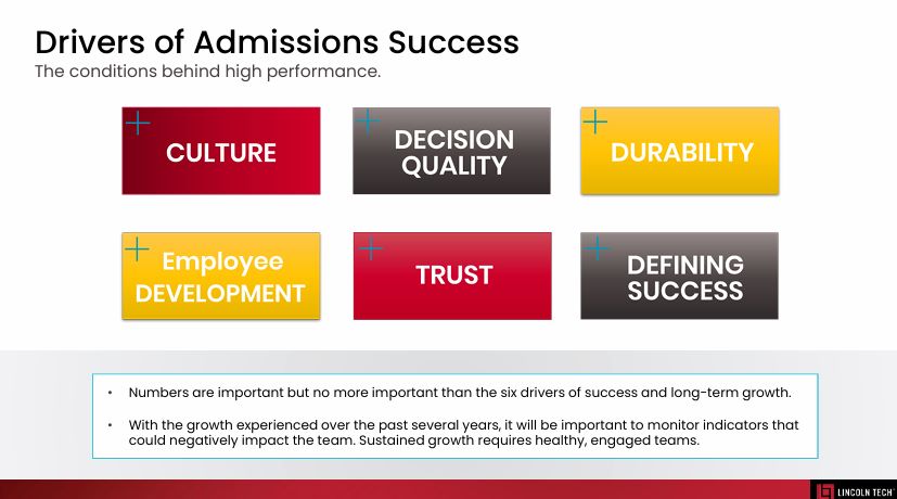 Drivers of Admissions Success  The conditions behind high performance.  Numbers are important but no more important than the six drivers of success and long-term growth.  With the growth experienced over the past several years, it will be important to monitor indicators that could negatively impact the team. Sustained growth requires healthy, engaged teams.