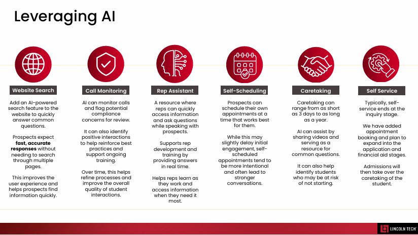 Caretaking  Caretaking can range from as short as 3 days to as long as a year.  AI can assist by sharing videos and serving as a resource for common questions.  It can also help identify students who may be at risk of not starting.  Self-Scheduling  Prospects can schedule their own appointments at a time that works best for them.  While this may slightly delay initial engagement, self-scheduled appointments tend to be more intentional and often lead to stronger conversations.  Leveraging AI  Website Search  Add an AI-powered search feature to the website to quickly answer common questions.  Prospects expect fast, accurate responses without needing to search through multiple pages.  This improves the user experience and helps prospects find information quickly.  Call Monitoring  AI can monitor calls and flag potential compliance concerns for review.  It can also identify positive interactions to help reinforce best practices and support ongoing training.  Over time, this helps refine processes and improve the overall quality of student interactions.  Rep Assistant  A resource where reps can quickly access information and ask questions while speaking with prospects.  Supports rep development and training by providing answers in real time.  Helps reps learn as they work and access information when they need it most.  Self Service  Typically, self-service ends at the inquiry stage.  We have added appointment booking and plan to expand into the application and financial aid stages.  Admissions will then take over the caretaking of the student.