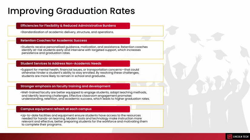 Improving Graduation Rates  Efficiencies for Flexibility & Reduced Administrative Burdens  Standardization of academic delivery, structure, and operations.  Retention Coaches for Academic Success  Students receive personalized guidance, motivation, and assistance. Retention coaches identify at-risk students early and intervene with targeted support, which increases persistence and graduation rates.  Student Services to Address Non-Academic Needs  Support for mental health, financial issues, or transportation concerns—that could otherwise hinder a student’s ability to stay enrolled. By resolving these challenges, students are more likely to remain in school and graduate.  Stronger emphasis on faculty training and development  Well-trained faculty are better equipped to engage students, adapt teaching methods, and identify learning challenges. Effective classroom engagement promotes understanding, retention, and academic success, which leads to higher graduation rates.  Campus equipment refresh at each campus  Up-to-date facilities and equipment ensure students have access to the resources needed for hands-on learning. Modern tools and technology make instruction more relevant and effective, better preparing students for the workforce and motivating them to complete their programs.