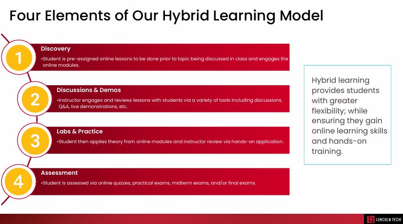 Four Elements of Our Hybrid Learning Model  Hybrid learning provides students with greater flexibility; while ensuring they gain online learning skills and hands-on training.  Discovery  Student is pre-assigned online lessons to be done prior to topic being discussed in class and engages the online modules.  Discussions & Demos  Instructor engages and reviews lessons with students via a variety of tools including discussions, Q&A, live demonstrations, etc.  Labs & Practice  Student then applies theory from online modules and instructor review via hands-on application.  Assessment  Student is assessed via online quizzes, practical exams, midterm exams, and/or final exams.