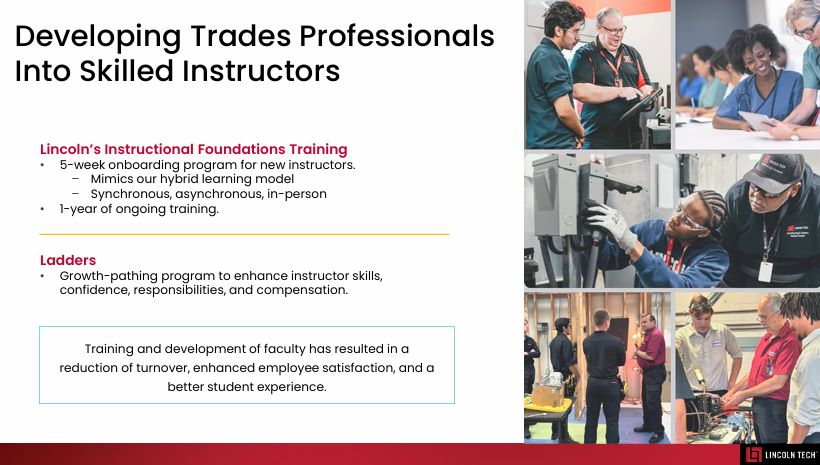 Developing Trades Professionals Into Skilled Instructors  Lincoln’s Instructional Foundations Training  5-week onboarding program for new instructors.  Mimics our hybrid learning model  Synchronous, asynchronous, in-person  1-year of ongoing training.  Ladders  Growth-pathing program to enhance instructor skills, confidence, responsibilities, and compensation.  Training and development of faculty has resulted in a reduction of turnover, enhanced employee satisfaction, and a better student experience.