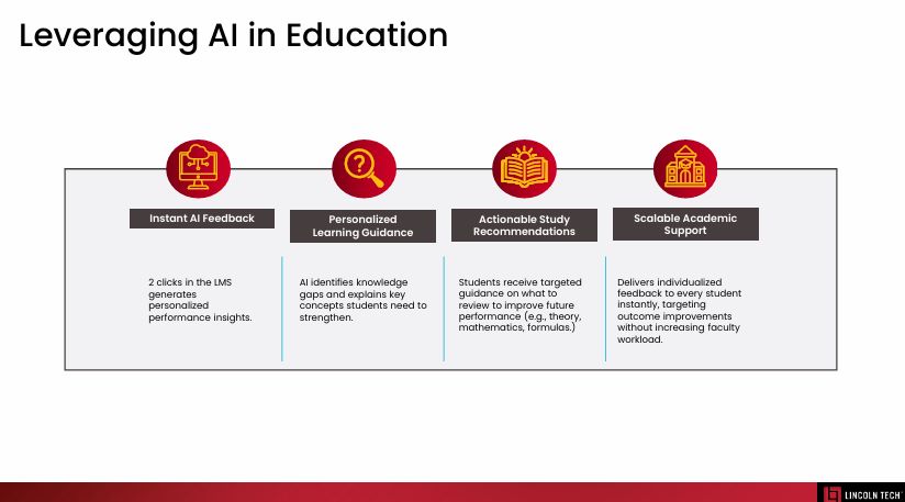 Leveraging AI in Education  2 clicks in the LMS generates personalized performance insights.  Instant AI Feedback  AI identifies knowledge gaps and explains key concepts students need to strengthen.  Personalized Learning Guidance  Students receive targeted guidance on what to review to improve future performance (e.g., theory, mathematics, formulas.)  Actionable Study Recommendations  Delivers individualized feedback to every student instantly, targeting outcome improvements without increasing faculty workload.  Scalable Academic Support
