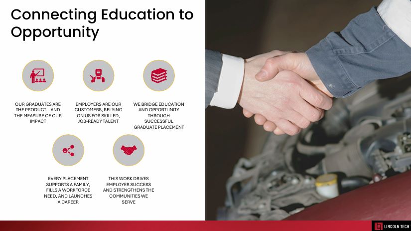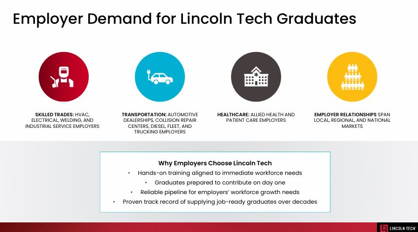 Employer Demand for Lincoln Tech Graduates  SKILLED TRADES: HVAC, ELECTRICAL, WELDING, AND INDUSTRIAL SERVICE EMPLOYERS  TRANSPORTATION: AUTOMOTIVE DEALERSHIPS, COLLISION REPAIR CENTERS, DIESEL, FLEET, AND TRUCKING EMPLOYERS  HEALTHCARE: ALLIED HEALTH AND PATIENT CARE EMPLOYERS  EMPLOYER RELATIONSHIPS SPAN LOCAL, REGIONAL, AND NATIONAL MARKETS  Why Employers Choose Lincoln Tech  Hands-on training aligned to immediate workforce needs  Graduates prepared to contribute on day one  Reliable pipeline for employers’ workforce growth needs  Proven track record of supplying job-ready graduates over decades