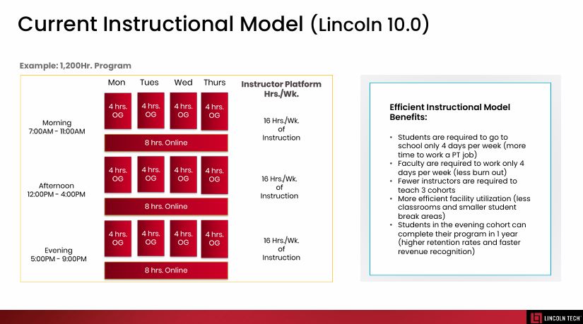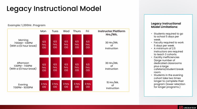 Current Instructional Model (Lincoln 10.0)  Example: 1,200Hr. Program  Efficient Instructional Model Benefits:  Students are required to go to school only 4 days per week (more time to work a PT job)  Faculty are required to work only 4 days per week (less burn out)  Fewer instructors are required to teach 3 cohorts  More efficient facility utilization (less classrooms and smaller student break areas)  Students in the evening cohort can complete their program in 1 year (higher retention rates and faster revenue recognition)