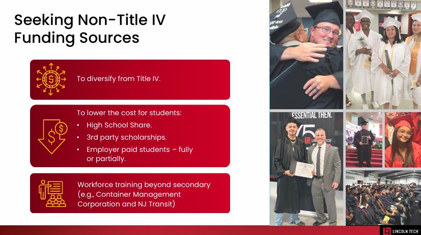 Seeking Non-Title IV Funding Sources  To diversify from Title IV.  To lower the cost for students:  High School Share.  3rd party scholarships.  Employer paid students – fully or partially.  Workforce training beyond secondary (e.g., Container Management Corporation and NJ Transit)