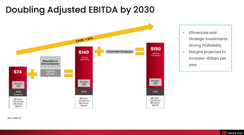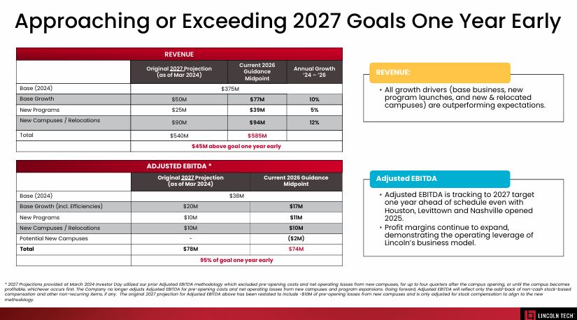 REVENUE:  All growth drivers (base business, new program launches, and new & relocated campuses) are outperforming expectations.  Adjusted EBITDA  Adjusted EBITDA is tracking to 2027 target one year ahead of schedule even with Houston, Levittown and Nashville opened 2025.  Profit margins continue to expand, demonstrating the operating leverage of Lincoln’s business model.  ADJUSTED EBITDA *  Original 2027 Projection (as of Mar 2024)  Current 2026 Guidance Midpoint  Base (2024)  $38M  Base Growth (incl. Efficiencies)  $20M  $17M  New Programs  $10M  $11M  New Campuses / Relocations  $10M  $10M  Potential New Campuses  -  ($2M)  Total  $78M  $74M  95% of goal one year early  * 2027 Projections provided at March 2024 Investor Day utilized our prior Adjusted EBITDA methodology which excluded pre-opening costs and net operating losses from new campuses, for up to four quarters after the campus opening, or until the campus becomes profitable, whichever occurs first. The Company no longer adjusts Adjusted EBITDA for pre-opening costs and net operating losses from new campuses and program expansions. Going forward, Adjusted EBITDA will reflect only the add-back of non-cash stock-based compensation and other non-recurring items, if any. The original 2027 projection for Adjusted EBITDA above has been restated to include ~$10M of pre-opening losses from new campuses and is only adjusted for stock compensation to align to the new methodology.  REVENUE  Original 2027 Projection (as of Mar 2024)  Current 2026 Guidance Midpoint  Annual Growth ‘24 – ’26  Base (2024)  $375M  Base Growth  $50M  $77M  10%  New Programs  $25M  $39M  5%  New Campuses / Relocations  $90M  $94M  12%  Total  $540M  $585M  $45M above goal one year early  Approaching or Exceeding 2027 Goals One Year Early