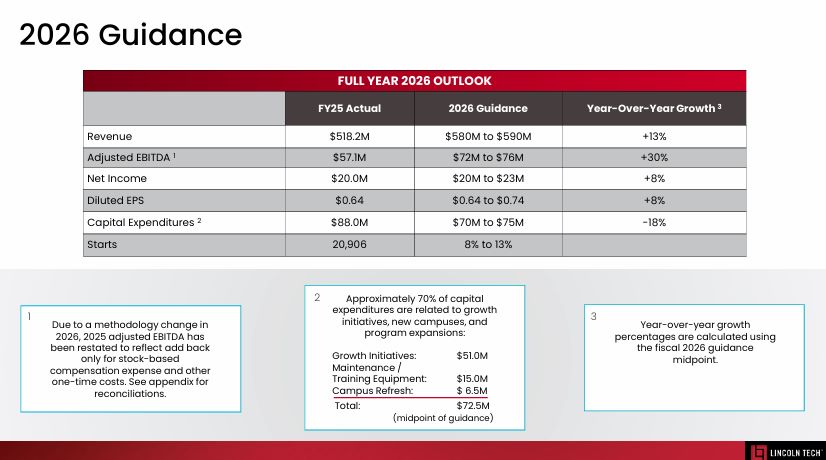 2026 Guidance  FULL YEAR 2026 OUTLOOK  FY25 Actual  2026 Guidance  Year-Over-Year Growth 3  Revenue  $518.2M  $580M to $590M  +13%  Adjusted EBITDA 1  $57.1M  $72M to $76M  +30%  Net Income  $20.0M  $20M to $23M  +8%  Diluted EPS  $0.64  $0.64 to $0.74  +8%  Capital Expenditures 2  $88.0M  $70M to $75M  -18%  Starts  20,906  8% to 13%  Due to a methodology change in 2026, 2025 adjusted EBITDA has been restated to reflect add back only for stock-based compensation expense and other one-time costs. See appendix for reconciliations.  Year-over-year growth percentages are calculated using the fiscal 2026 guidance midpoint.  Growth Initiatives: $51.0M Maintenance /  Training Equipment: $15.0M  Campus Refresh: $ 6.5M  Total:  $72.5M  (midpoint of guidance)  1  2 Approximately 70% of capital expenditures are related to growth  initiatives, new campuses, and program expansions:  3