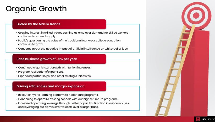Organic Growth  Growing interest in skilled trades training as employer demand for skilled workers continues to exceed supply.  Public's questioning the value of the traditional four-year college education continues to grow.  Concerns about the negative impact of artificial intelligence on white-collar jobs.  Fueled by the Macro trends  Base business growth of ~5% per year  Continued organic start growth with tuition increases.  Program replications/expansions.  Expanded partnerships, and other strategic initiatives.  Driving efficiencies and margin expansion  Rollout of hybrid learning platform to healthcare programs.  Continuing to optimize existing schools with our highest-return programs.  Increased operating leverage through better capacity utilization in our campuses and leveraging our administrative costs over a larger base.