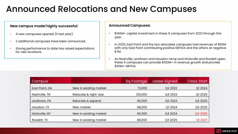 Announced Relocations and New Campuses  Campus  Sq Footage  Lease Signed  Class Start  East Point, GA  New in existing market  72,000  Q2 2022  Q1 2024  Nashville, TN  Relocate & right-size  125,000  Q4 2023  Q1 2025  Levittown, PA  Relocate & expand  90,000  Q3 2023  Q3 2025  Houston, TX  New market  98,000  Q1 2024  Q3 2025  Hicksville, NY  New in existing market  65,000  Q4 2024  Q4 2026  Rowlett, TX  New in existing market  88,000  Q3 2025  Q1 2027  New campus model highly successful:  4 new campuses opened (3 last year).  2 additional campuses have been announced.  Strong performance to date has raised expectations for new locations.  Announced Campuses:  $140M+ capital investment in these 6 campuses from 2023 through this year.  In 2025, East Point and the two relocated campuses had revenues of $60M with only East Point contributing positive EBITDA and the others at negative  $7M.  As Nashville, Levittown and Houston ramp and Hicksville and Rowlett open, these 6 campuses can provide $100M+ in revenue growth and provide  $50M+ EBITDA.