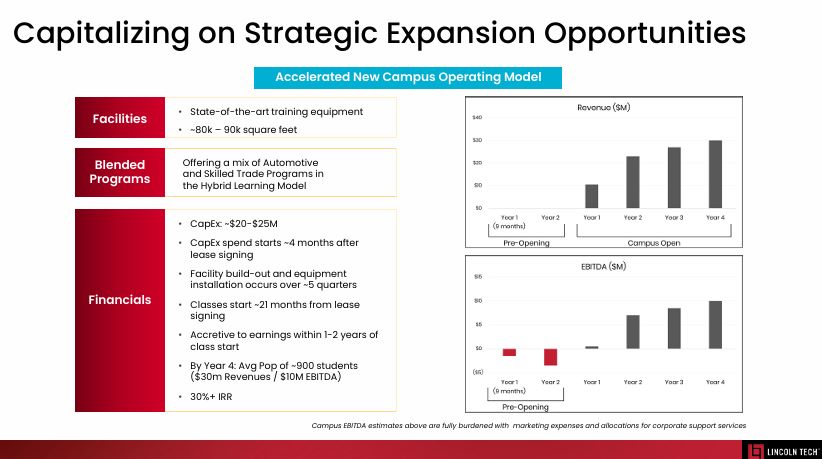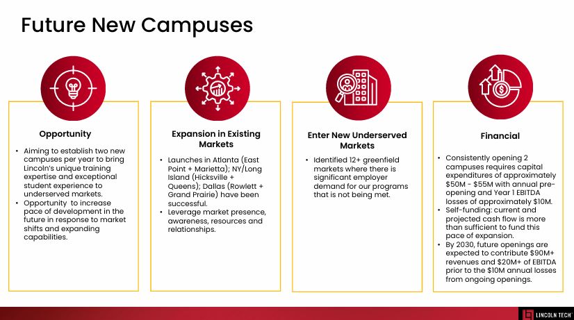 Future New Campuses  Consistently opening 2 campuses requires capital expenditures of approximately  $50M - $55M with annual pre-opening and Year 1 EBITDA losses of approximately $10M.  Self-funding: current and projected cash flow is more than sufficient to fund this pace of expansion.  By 2030, future openings are expected to contribute $90M+ revenues and $20M+ of EBITDA prior to the $10M annual losses from ongoing openings.  Enter New Underserved Markets  Identified 12+ greenfield markets where there is significant employer demand for our programs that is not being met.  Expansion in Existing Markets  Launches in Atlanta (East Point + Marietta); NY/Long Island (Hicksville + Queens); Dallas (Rowlett + Grand Prairie) have been successful.  Leverage market presence, awareness, resources and relationships.  Opportunity  Aiming to establish two new campuses per year to bring Lincoln’s unique training expertise and exceptional student experience to underserved markets.  Opportunity to increase pace of development in the future in response to market shifts and expanding capabilities.  Financial