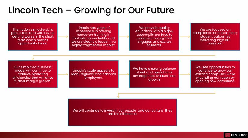 The nation’s middle skills gap is real and will only be getting worse in the short term which means opportunity for us.  Lincoln has years of experience in offering hands-on training in multiple career fields, and we are clearly a leader in a highly fragmented market.  We provide quality education with a highly accomplished faculty using technology that engages and excites students.  We are focused on compliance and exemplary student outcomes delivering high ROI program.  Our simplified business model will continue to achieve operating efficiencies that will drive further margin growth.  Lincoln's scale appeals to local, regional and national employers.  We have a strong balance sheet and operational leverage that will fund our growth.  We see opportunities to continue to grow our existing campuses while expanding our reach by opening new campuses.  We will continue to invest in our people and our culture. They are the difference.  Lincoln Tech – Growing for Our Future
