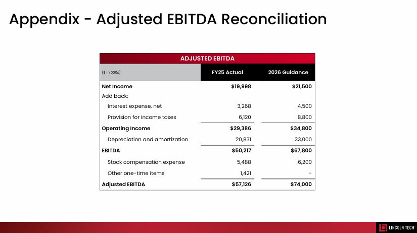 ADJUSTED EBITDA  ($ in 000s)  FY25 Actual  2026 Guidance  Net Income  $19,998  $21,500  Add back:  Interest expense, net  3,268  4,500  Provision for income taxes  6,120  8,800  Operating Income  $29,386  $34,800  Depreciation and amortization  20,831  33,000  EBITDA  $50,217  $67,800  Stock compensation expense  5,488  6,200  Other one-time items  1,421  -  Adjusted EBITDA  $57,126  $74,000  Appendix - Adjusted EBITDA Reconciliation