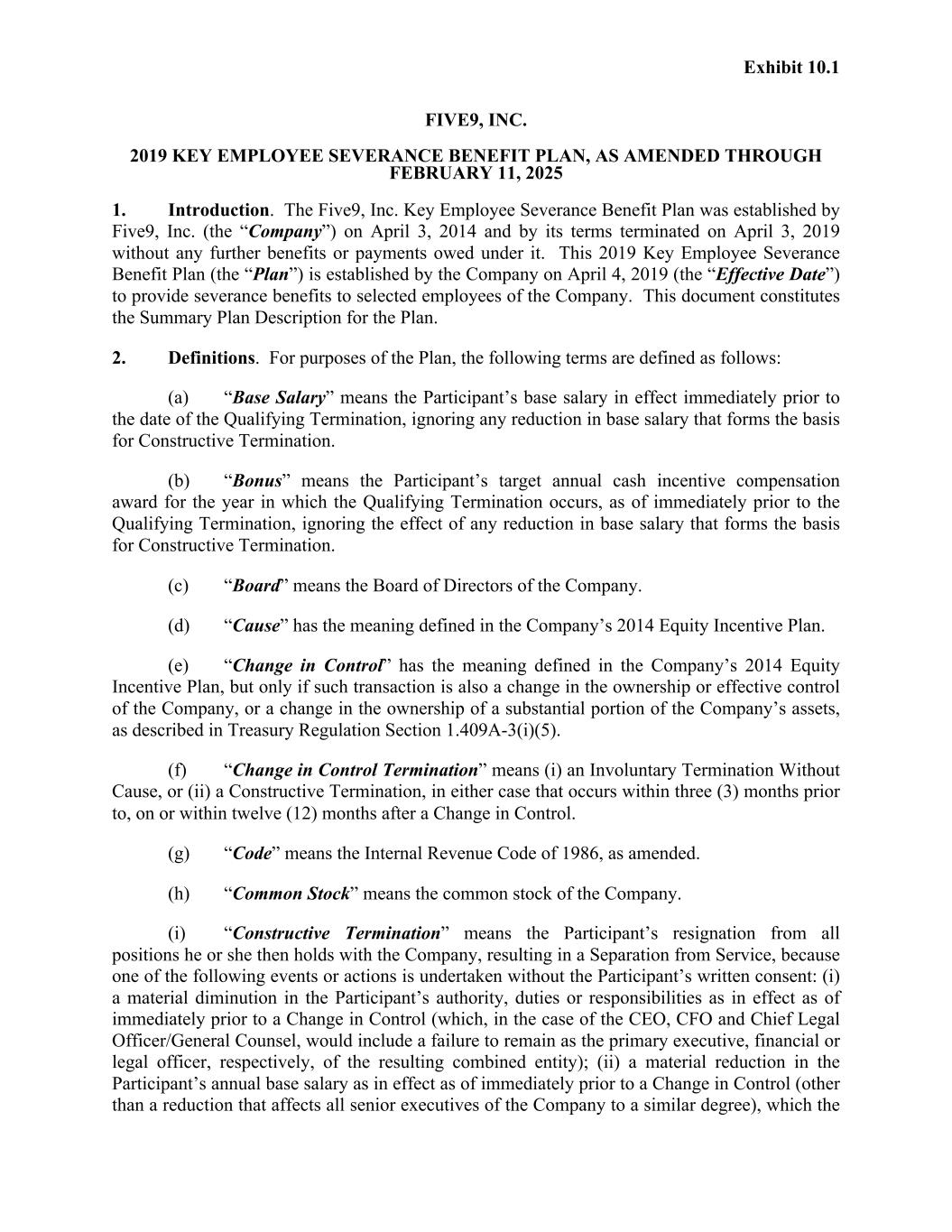 Exhibit 10.1 FIVE9, INC. 2019 KEY EMPLOYEE SEVERANCE BENEFIT PLAN, AS AMENDED THROUGH FEBRUARY 11, 2025 1. Introduction. The Five9, Inc. Key Employee Severance Benefit Plan was established by Five9, Inc. (the “Company”) on April 3, 2014 and by its terms terminated on April 3, 2019 without any further benefits or payments owed under it. This 2019 Key Employee Severance Benefit Plan (the “Plan”) is established by the Company on April 4, 2019 (the “Effective Date”) to provide severance benefits to selected employees of the Company. This document constitutes the Summary Plan Description for the Plan. 2. Definitions. For purposes of the Plan, the following terms are defined as follows: (a) “Base Salary” means the Participant’s base salary in effect immediately prior to the date of the Qualifying Termination, ignoring any reduction in base salary that forms the basis for Constructive Termination. (b) “Bonus” means the Participant’s target annual cash incentive compensation award for the year in which the Qualifying Termination occurs, as of immediately prior to the Qualifying Termination, ignoring the effect of any reduction in base salary that forms the basis for Constructive Termination. (c) “Board” means the Board of Directors of the Company. (d) “Cause” has the meaning defined in the Company’s 2014 Equity Incentive Plan. (e) “Change in Control” has the meaning defined in the Company’s 2014 Equity Incentive Plan, but only if such transaction is also a change in the ownership or effective control of the Company, or a change in the ownership of a substantial portion of the Company’s assets, as described in Treasury Regulation Section 1.409A-3(i)(5). (f) “Change in Control Termination” means (i) an Involuntary Termination Without Cause, or (ii) a Constructive Termination, in either case that occurs within three (3) months prior to, on or within twelve (12) months after a Change in Control. (g) “Code” means the Internal Revenue Code of 1986, as amended. (h) “Common Stock” means the common stock of the Company. (i) “Constructive Termination” means the Participant’s resignation from all positions he or she then holds with the Company, resulting in a Separation from Service, because one of the following events or actions is undertaken without the Participant’s written consent: (i) a material diminution in the Participant’s authority, duties or responsibilities as in effect as of immediately prior to a Change in Control (which, in the case of the CEO, CFO and Chief Legal Officer/General Counsel, would include a failure to remain as the primary executive, financial or legal officer, respectively, of the resulting combined entity); (ii) a material reduction in the Participant’s annual base salary as in effect as of immediately prior to a Change in Control (other than a reduction that affects all senior executives of the Company to a similar degree), which the
