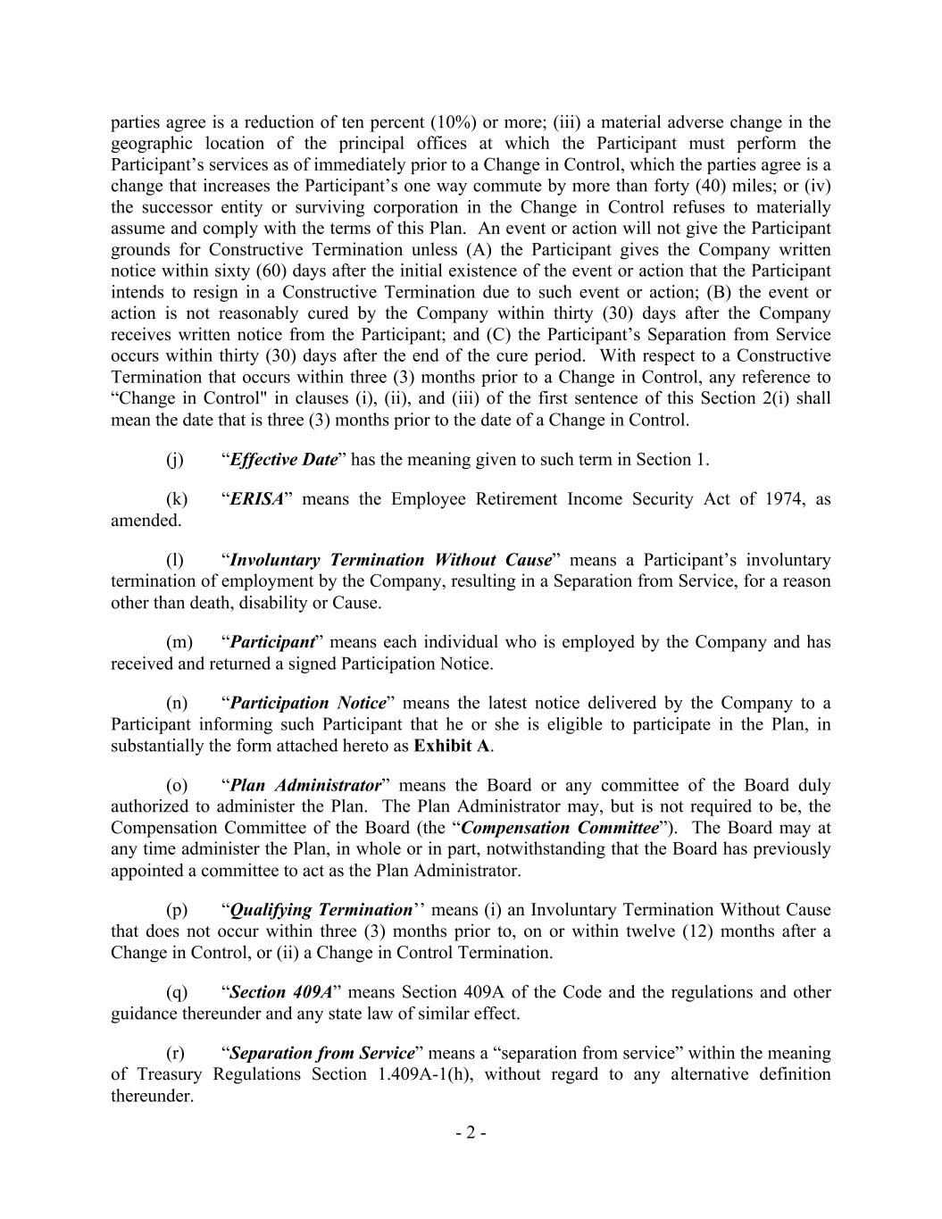 - 2 - parties agree is a reduction of ten percent (10%) or more; (iii) a material adverse change in the geographic location of the principal offices at which the Participant must perform the Participant’s services as of immediately prior to a Change in Control, which the parties agree is a change that increases the Participant’s one way commute by more than forty (40) miles; or (iv) the successor entity or surviving corporation in the Change in Control refuses to materially assume and comply with the terms of this Plan. An event or action will not give the Participant grounds for Constructive Termination unless (A) the Participant gives the Company written notice within sixty (60) days after the initial existence of the event or action that the Participant intends to resign in a Constructive Termination due to such event or action; (B) the event or action is not reasonably cured by the Company within thirty (30) days after the Company receives written notice from the Participant; and (C) the Participant’s Separation from Service occurs within thirty (30) days after the end of the cure period. With respect to a Constructive Termination that occurs within three (3) months prior to a Change in Control, any reference to “Change in Control" in clauses (i), (ii), and (iii) of the first sentence of this Section 2(i) shall mean the date that is three (3) months prior to the date of a Change in Control. (j) “Effective Date” has the meaning given to such term in Section 1. (k) “ERISA” means the Employee Retirement Income Security Act of 1974, as amended. (l) “Involuntary Termination Without Cause” means a Participant’s involuntary termination of employment by the Company, resulting in a Separation from Service, for a reason other than death, disability or Cause. (m) “Participant” means each individual who is employed by the Company and has received and returned a signed Participation Notice. (n) “Participation Notice” means the latest notice delivered by the Company to a Participant informing such Participant that he or she is eligible to participate in the Plan, in substantially the form attached hereto as Exhibit A. (o) “Plan Administrator” means the Board or any committee of the Board duly authorized to administer the Plan. The Plan Administrator may, but is not required to be, the Compensation Committee of the Board (the “Compensation Committee”). The Board may at any time administer the Plan, in whole or in part, notwithstanding that the Board has previously appointed a committee to act as the Plan Administrator. (p) “Qualifying Termination’’ means (i) an Involuntary Termination Without Cause that does not occur within three (3) months prior to, on or within twelve (12) months after a Change in Control, or (ii) a Change in Control Termination. (q) “Section 409A” means Section 409A of the Code and the regulations and other guidance thereunder and any state law of similar effect. (r) “Separation from Service” means a “separation from service” within the meaning of Treasury Regulations Section 1.409A-1(h), without regard to any alternative definition thereunder.