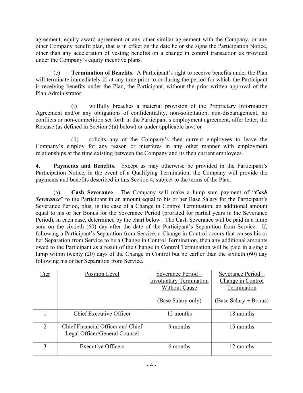 - 4 - agreement, equity award agreement or any other similar agreement with the Company, or any other Company benefit plan, that is in effect on the date he or she signs the Participation Notice, other than any acceleration of vesting benefits on a change in control transaction as provided under the Company’s equity incentive plans. (c) Termination of Benefits. A Participant’s right to receive benefits under the Plan will terminate immediately if, at any time prior to or during the period for which the Participant is receiving benefits under the Plan, the Participant, without the prior written approval of the Plan Administrator: (i) willfully breaches a material provision of the Proprietary Information Agreement and/or any obligations of confidentiality, non-solicitation, non-disparagement, no conflicts or non-competition set forth in the Participant’s employment agreement, offer letter, the Release (as defined in Section 5(a) below) or under applicable law; or (ii) solicits any of the Company’s then current employees to leave the Company’s employ for any reason or interferes in any other manner with employment relationships at the time existing between the Company and its then current employees. 4. Payments and Benefits. Except as may otherwise be provided in the Participant’s Participation Notice, in the event of a Qualifying Termination, the Company will provide the payments and benefits described in this Section 4, subject to the terms of the Plan. (a) Cash Severance. The Company will make a lump sum payment of “Cash Severance” to the Participant in an amount equal to his or her Base Salary for the Participant’s Severance Period, plus, in the case of a Change in Control Termination, an additional amount equal to his or her Bonus for the Severance Period (prorated for partial years in the Severance Period), in each case, determined by the chart below. The Cash Severance will be paid in a lump sum on the sixtieth (60) day after the date of the Participant’s Separation from Service. If, following a Participant’s Separation from Service, a Change in Control occurs that causes his or her Separation from Service to be a Change in Control Termination, then any additional amounts owed to the Participant as a result of the Change in Control Termination will be paid in a single lump within twenty (20) days of the Change in Control but no earlier than the sixtieth (60) day following his or her Separation from Service. Tier Position Level Severance Period – Involuntary Termination Without Cause (Base Salary only) Severance Period – Change in Control Termination (Base Salary + Bonus) 1 Chief Executive Officer 12 months 18 months 2 Chief Financial Officer and Chief Legal Officer/General Counsel 9 months 15 months 3 Executive Officers 6 months 12 months