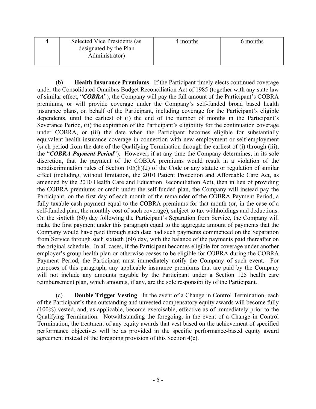 - 5 - 4 Selected Vice Presidents (as designated by the Plan Administrator) 4 months 6 months (b) Health Insurance Premiums. If the Participant timely elects continued coverage under the Consolidated Omnibus Budget Reconciliation Act of 1985 (together with any state law of similar effect, “COBRA”), the Company will pay the full amount of the Participant’s COBRA premiums, or will provide coverage under the Company’s self-funded broad based health insurance plans, on behalf of the Participant, including coverage for the Participant’s eligible dependents, until the earliest of (i) the end of the number of months in the Participant’s Severance Period, (ii) the expiration of the Participant’s eligibility for the continuation coverage under COBRA, or (iii) the date when the Participant becomes eligible for substantially equivalent health insurance coverage in connection with new employment or self-employment (such period from the date of the Qualifying Termination through the earliest of (i) through (iii), the “COBRA Payment Period”). However, if at any time the Company determines, in its sole discretion, that the payment of the COBRA premiums would result in a violation of the nondiscrimination rules of Section 105(h)(2) of the Code or any statute or regulation of similar effect (including, without limitation, the 2010 Patient Protection and Affordable Care Act, as amended by the 2010 Health Care and Education Reconciliation Act), then in lieu of providing the COBRA premiums or credit under the self-funded plan, the Company will instead pay the Participant, on the first day of each month of the remainder of the COBRA Payment Period, a fully taxable cash payment equal to the COBRA premiums for that month (or, in the case of a self-funded plan, the monthly cost of such coverage), subject to tax withholdings and deductions. On the sixtieth (60) day following the Participant’s Separation from Service, the Company will make the first payment under this paragraph equal to the aggregate amount of payments that the Company would have paid through such date had such payments commenced on the Separation from Service through such sixtieth (60) day, with the balance of the payments paid thereafter on the original schedule. In all cases, if the Participant becomes eligible for coverage under another employer’s group health plan or otherwise ceases to be eligible for COBRA during the COBRA Payment Period, the Participant must immediately notify the Company of such event. For purposes of this paragraph, any applicable insurance premiums that are paid by the Company will not include any amounts payable by the Participant under a Section 125 health care reimbursement plan, which amounts, if any, are the sole responsibility of the Participant. (c) Double Trigger Vesting. In the event of a Change in Control Termination, each of the Participant’s then outstanding and unvested compensatory equity awards will become fully (100%) vested, and, as applicable, become exercisable, effective as of immediately prior to the Qualifying Termination. Notwithstanding the foregoing, in the event of a Change in Control Termination, the treatment of any equity awards that vest based on the achievement of specified performance objectives will be as provided in the specific performance-based equity award agreement instead of the foregoing provision of this Section 4(c).