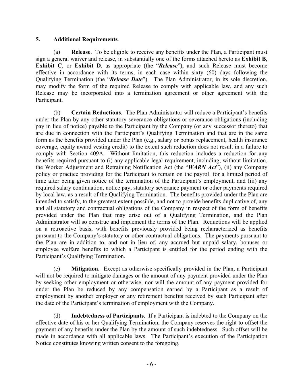- 6 - 5. Additional Requirements. (a) Release. To be eligible to receive any benefits under the Plan, a Participant must sign a general waiver and release, in substantially one of the forms attached hereto as Exhibit B, Exhibit C, or Exhibit D, as appropriate (the “Release”), and such Release must become effective in accordance with its terms, in each case within sixty (60) days following the Qualifying Termination (the “Release Date”). The Plan Administrator, in its sole discretion, may modify the form of the required Release to comply with applicable law, and any such Release may be incorporated into a termination agreement or other agreement with the Participant. (b) Certain Reductions. The Plan Administrator will reduce a Participant’s benefits under the Plan by any other statutory severance obligations or severance obligations (including pay in lieu of notice) payable to the Participant by the Company (or any successor thereto) that are due in connection with the Participant’s Qualifying Termination and that are in the same form as the benefits provided under the Plan (e.g., salary or bonus replacement, health insurance coverage, equity award vesting credit) to the extent such reduction does not result in a failure to comply with Section 409A. Without limitation, this reduction includes a reduction for any benefits required pursuant to (i) any applicable legal requirement, including, without limitation, the Worker Adjustment and Retraining Notification Act (the “WARN Act”), (ii) any Company policy or practice providing for the Participant to remain on the payroll for a limited period of time after being given notice of the termination of the Participant’s employment, and (iii) any required salary continuation, notice pay, statutory severance payment or other payments required by local law, as a result of the Qualifying Termination. The benefits provided under the Plan are intended to satisfy, to the greatest extent possible, and not to provide benefits duplicative of, any and all statutory and contractual obligations of the Company in respect of the form of benefits provided under the Plan that may arise out of a Qualifying Termination, and the Plan Administrator will so construe and implement the terms of the Plan. Reductions will be applied on a retroactive basis, with benefits previously provided being recharacterized as benefits pursuant to the Company’s statutory or other contractual obligations. The payments pursuant to the Plan are in addition to, and not in lieu of, any accrued but unpaid salary, bonuses or employee welfare benefits to which a Participant is entitled for the period ending with the Participant’s Qualifying Termination. (c) Mitigation. Except as otherwise specifically provided in the Plan, a Participant will not be required to mitigate damages or the amount of any payment provided under the Plan by seeking other employment or otherwise, nor will the amount of any payment provided for under the Plan be reduced by any compensation earned by a Participant as a result of employment by another employer or any retirement benefits received by such Participant after the date of the Participant’s termination of employment with the Company. (d) Indebtedness of Participants. If a Participant is indebted to the Company on the effective date of his or her Qualifying Termination, the Company reserves the right to offset the payment of any benefits under the Plan by the amount of such indebtedness. Such offset will be made in accordance with all applicable laws. The Participant’s execution of the Participation Notice constitutes knowing written consent to the foregoing.