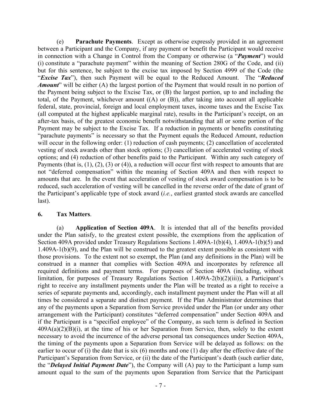 - 7 - (e) Parachute Payments. Except as otherwise expressly provided in an agreement between a Participant and the Company, if any payment or benefit the Participant would receive in connection with a Change in Control from the Company or otherwise (a “Payment”) would (i) constitute a “parachute payment” within the meaning of Section 280G of the Code, and (ii) but for this sentence, be subject to the excise tax imposed by Section 4999 of the Code (the “Excise Tax”), then such Payment will be equal to the Reduced Amount. The “Reduced Amount” will be either (A) the largest portion of the Payment that would result in no portion of the Payment being subject to the Excise Tax, or (B) the largest portion, up to and including the total, of the Payment, whichever amount ((A) or (B)), after taking into account all applicable federal, state, provincial, foreign and local employment taxes, income taxes and the Excise Tax (all computed at the highest applicable marginal rate), results in the Participant’s receipt, on an after-tax basis, of the greatest economic benefit notwithstanding that all or some portion of the Payment may be subject to the Excise Tax. If a reduction in payments or benefits constituting “parachute payments” is necessary so that the Payment equals the Reduced Amount, reduction will occur in the following order: (1) reduction of cash payments; (2) cancellation of accelerated vesting of stock awards other than stock options; (3) cancellation of accelerated vesting of stock options; and (4) reduction of other benefits paid to the Participant. Within any such category of Payments (that is, (1), (2), (3) or (4)), a reduction will occur first with respect to amounts that are not “deferred compensation” within the meaning of Section 409A and then with respect to amounts that are. In the event that acceleration of vesting of stock award compensation is to be reduced, such acceleration of vesting will be cancelled in the reverse order of the date of grant of the Participant’s applicable type of stock award (i.e., earliest granted stock awards are cancelled last). 6. Tax Matters. (a) Application of Section 409A. It is intended that all of the benefits provided under the Plan satisfy, to the greatest extent possible, the exemptions from the application of Section 409A provided under Treasury Regulations Sections 1.409A-1(b)(4), 1.409A-1(b)(5) and 1.409A-1(b)(9), and the Plan will be construed to the greatest extent possible as consistent with those provisions. To the extent not so exempt, the Plan (and any definitions in the Plan) will be construed in a manner that complies with Section 409A and incorporates by reference all required definitions and payment terms. For purposes of Section 409A (including, without limitation, for purposes of Treasury Regulations Section 1.409A-2(b)(2)(iii)), a Participant’s right to receive any installment payments under the Plan will be treated as a right to receive a series of separate payments and, accordingly, each installment payment under the Plan will at all times be considered a separate and distinct payment. If the Plan Administrator determines that any of the payments upon a Separation from Service provided under the Plan (or under any other arrangement with the Participant) constitutes “deferred compensation” under Section 409A and if the Participant is a “specified employee” of the Company, as such term is defined in Section 409A(a)(2)(B)(i), at the time of his or her Separation from Service, then, solely to the extent necessary to avoid the incurrence of the adverse personal tax consequences under Section 409A, the timing of the payments upon a Separation from Service will be delayed as follows: on the earlier to occur of (i) the date that is six (6) months and one (1) day after the effective date of the Participant’s Separation from Service, or (ii) the date of the Participant’s death (such earlier date, the “Delayed Initial Payment Date”), the Company will (A) pay to the Participant a lump sum amount equal to the sum of the payments upon Separation from Service that the Participant