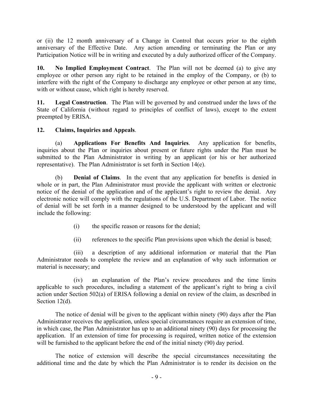 - 9 - or (ii) the 12 month anniversary of a Change in Control that occurs prior to the eighth anniversary of the Effective Date. Any action amending or terminating the Plan or any Participation Notice will be in writing and executed by a duly authorized officer of the Company. 10. No Implied Employment Contract. The Plan will not be deemed (a) to give any employee or other person any right to be retained in the employ of the Company, or (b) to interfere with the right of the Company to discharge any employee or other person at any time, with or without cause, which right is hereby reserved. 11. Legal Construction. The Plan will be governed by and construed under the laws of the State of California (without regard to principles of conflict of laws), except to the extent preempted by ERISA. 12. Claims, Inquiries and Appeals. (a) Applications For Benefits And Inquiries. Any application for benefits, inquiries about the Plan or inquiries about present or future rights under the Plan must be submitted to the Plan Administrator in writing by an applicant (or his or her authorized representative). The Plan Administrator is set forth in Section 14(e). (b) Denial of Claims. In the event that any application for benefits is denied in whole or in part, the Plan Administrator must provide the applicant with written or electronic notice of the denial of the application and of the applicant’s right to review the denial. Any electronic notice will comply with the regulations of the U.S. Department of Labor. The notice of denial will be set forth in a manner designed to be understood by the applicant and will include the following: (i) the specific reason or reasons for the denial; (ii) references to the specific Plan provisions upon which the denial is based; (iii) a description of any additional information or material that the Plan Administrator needs to complete the review and an explanation of why such information or material is necessary; and (iv) an explanation of the Plan’s review procedures and the time limits applicable to such procedures, including a statement of the applicant’s right to bring a civil action under Section 502(a) of ERISA following a denial on review of the claim, as described in Section 12(d). The notice of denial will be given to the applicant within ninety (90) days after the Plan Administrator receives the application, unless special circumstances require an extension of time, in which case, the Plan Administrator has up to an additional ninety (90) days for processing the application. If an extension of time for processing is required, written notice of the extension will be furnished to the applicant before the end of the initial ninety (90) day period. The notice of extension will describe the special circumstances necessitating the additional time and the date by which the Plan Administrator is to render its decision on the