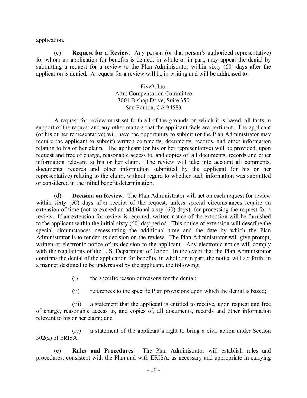 - 10 - application. (c) Request for a Review. Any person (or that person’s authorized representative) for whom an application for benefits is denied, in whole or in part, may appeal the denial by submitting a request for a review to the Plan Administrator within sixty (60) days after the application is denied. A request for a review will be in writing and will be addressed to: Five9, Inc. Attn: Compensation Committee 3001 Bishop Drive, Suite 350 San Ramon, CA 94583 A request for review must set forth all of the grounds on which it is based, all facts in support of the request and any other matters that the applicant feels are pertinent. The applicant (or his or her representative) will have the opportunity to submit (or the Plan Administrator may require the applicant to submit) written comments, documents, records, and other information relating to his or her claim. The applicant (or his or her representative) will be provided, upon request and free of charge, reasonable access to, and copies of, all documents, records and other information relevant to his or her claim. The review will take into account all comments, documents, records and other information submitted by the applicant (or his or her representative) relating to the claim, without regard to whether such information was submitted or considered in the initial benefit determination. (d) Decision on Review. The Plan Administrator will act on each request for review within sixty (60) days after receipt of the request, unless special circumstances require an extension of time (not to exceed an additional sixty (60) days), for processing the request for a review. If an extension for review is required, written notice of the extension will be furnished to the applicant within the initial sixty (60) day period. This notice of extension will describe the special circumstances necessitating the additional time and the date by which the Plan Administrator is to render its decision on the review. The Plan Administrator will give prompt, written or electronic notice of its decision to the applicant. Any electronic notice will comply with the regulations of the U.S. Department of Labor. In the event that the Plan Administrator confirms the denial of the application for benefits, in whole or in part, the notice will set forth, in a manner designed to be understood by the applicant, the following: (i) the specific reason or reasons for the denial; (ii) references to the specific Plan provisions upon which the denial is based; (iii) a statement that the applicant is entitled to receive, upon request and free of charge, reasonable access to, and copies of, all documents, records and other information relevant to his or her claim; and (iv) a statement of the applicant’s right to bring a civil action under Section 502(a) of ERISA. (e) Rules and Procedures. The Plan Administrator will establish rules and procedures, consistent with the Plan and with ERISA, as necessary and appropriate in carrying