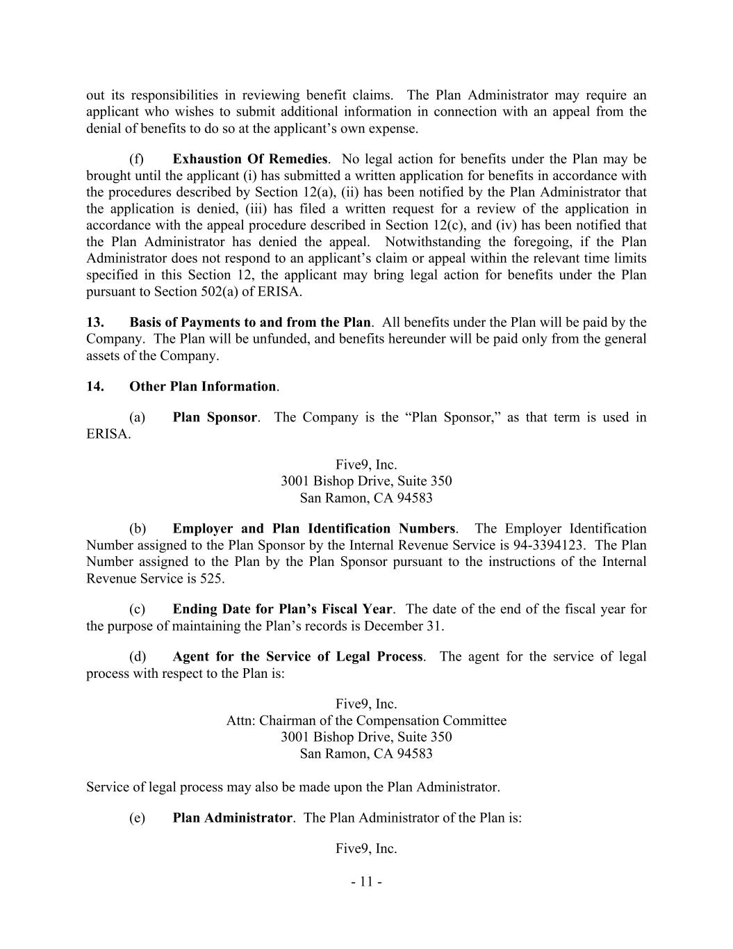 - 11 - out its responsibilities in reviewing benefit claims. The Plan Administrator may require an applicant who wishes to submit additional information in connection with an appeal from the denial of benefits to do so at the applicant’s own expense. (f) Exhaustion Of Remedies. No legal action for benefits under the Plan may be brought until the applicant (i) has submitted a written application for benefits in accordance with the procedures described by Section 12(a), (ii) has been notified by the Plan Administrator that the application is denied, (iii) has filed a written request for a review of the application in accordance with the appeal procedure described in Section 12(c), and (iv) has been notified that the Plan Administrator has denied the appeal. Notwithstanding the foregoing, if the Plan Administrator does not respond to an applicant’s claim or appeal within the relevant time limits specified in this Section 12, the applicant may bring legal action for benefits under the Plan pursuant to Section 502(a) of ERISA. 13. Basis of Payments to and from the Plan. All benefits under the Plan will be paid by the Company. The Plan will be unfunded, and benefits hereunder will be paid only from the general assets of the Company. 14. Other Plan Information. (a) Plan Sponsor. The Company is the “Plan Sponsor,” as that term is used in ERISA. Five9, Inc. 3001 Bishop Drive, Suite 350 San Ramon, CA 94583 (b) Employer and Plan Identification Numbers. The Employer Identification Number assigned to the Plan Sponsor by the Internal Revenue Service is 94-3394123. The Plan Number assigned to the Plan by the Plan Sponsor pursuant to the instructions of the Internal Revenue Service is 525. (c) Ending Date for Plan’s Fiscal Year. The date of the end of the fiscal year for the purpose of maintaining the Plan’s records is December 31. (d) Agent for the Service of Legal Process. The agent for the service of legal process with respect to the Plan is: Five9, Inc. Attn: Chairman of the Compensation Committee 3001 Bishop Drive, Suite 350 San Ramon, CA 94583 Service of legal process may also be made upon the Plan Administrator. (e) Plan Administrator. The Plan Administrator of the Plan is: Five9, Inc.