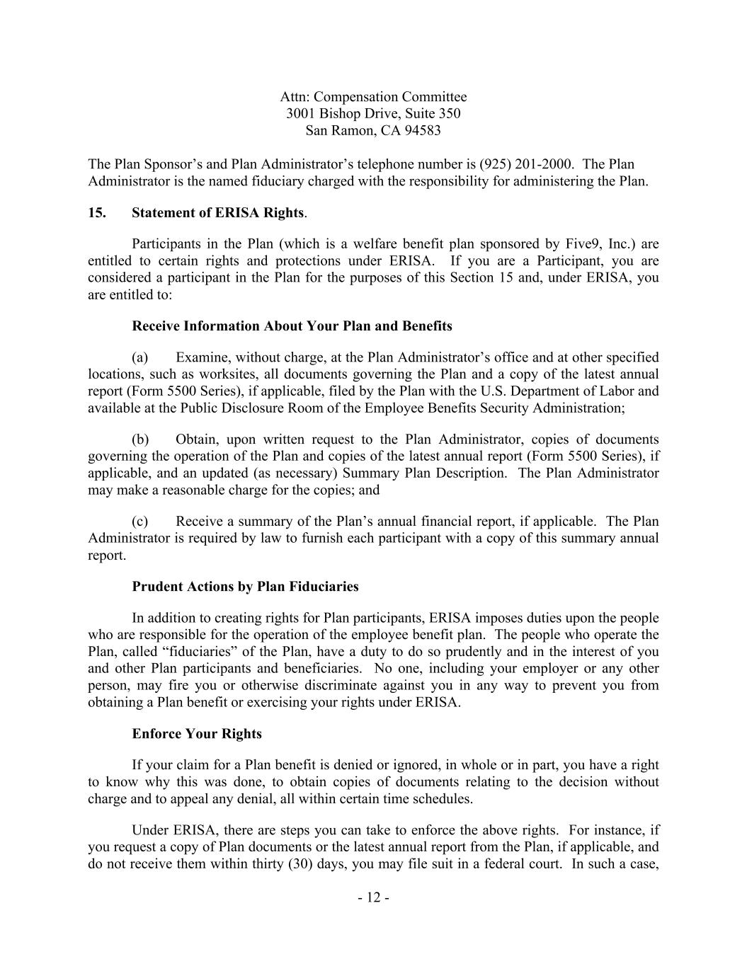 - 12 - Attn: Compensation Committee 3001 Bishop Drive, Suite 350 San Ramon, CA 94583 The Plan Sponsor’s and Plan Administrator’s telephone number is (925) 201-2000. The Plan Administrator is the named fiduciary charged with the responsibility for administering the Plan. 15. Statement of ERISA Rights. Participants in the Plan (which is a welfare benefit plan sponsored by Five9, Inc.) are entitled to certain rights and protections under ERISA. If you are a Participant, you are considered a participant in the Plan for the purposes of this Section 15 and, under ERISA, you are entitled to: Receive Information About Your Plan and Benefits (a) Examine, without charge, at the Plan Administrator’s office and at other specified locations, such as worksites, all documents governing the Plan and a copy of the latest annual report (Form 5500 Series), if applicable, filed by the Plan with the U.S. Department of Labor and available at the Public Disclosure Room of the Employee Benefits Security Administration; (b) Obtain, upon written request to the Plan Administrator, copies of documents governing the operation of the Plan and copies of the latest annual report (Form 5500 Series), if applicable, and an updated (as necessary) Summary Plan Description. The Plan Administrator may make a reasonable charge for the copies; and (c) Receive a summary of the Plan’s annual financial report, if applicable. The Plan Administrator is required by law to furnish each participant with a copy of this summary annual report. Prudent Actions by Plan Fiduciaries In addition to creating rights for Plan participants, ERISA imposes duties upon the people who are responsible for the operation of the employee benefit plan. The people who operate the Plan, called “fiduciaries” of the Plan, have a duty to do so prudently and in the interest of you and other Plan participants and beneficiaries. No one, including your employer or any other person, may fire you or otherwise discriminate against you in any way to prevent you from obtaining a Plan benefit or exercising your rights under ERISA. Enforce Your Rights If your claim for a Plan benefit is denied or ignored, in whole or in part, you have a right to know why this was done, to obtain copies of documents relating to the decision without charge and to appeal any denial, all within certain time schedules. Under ERISA, there are steps you can take to enforce the above rights. For instance, if you request a copy of Plan documents or the latest annual report from the Plan, if applicable, and do not receive them within thirty (30) days, you may file suit in a federal court. In such a case,