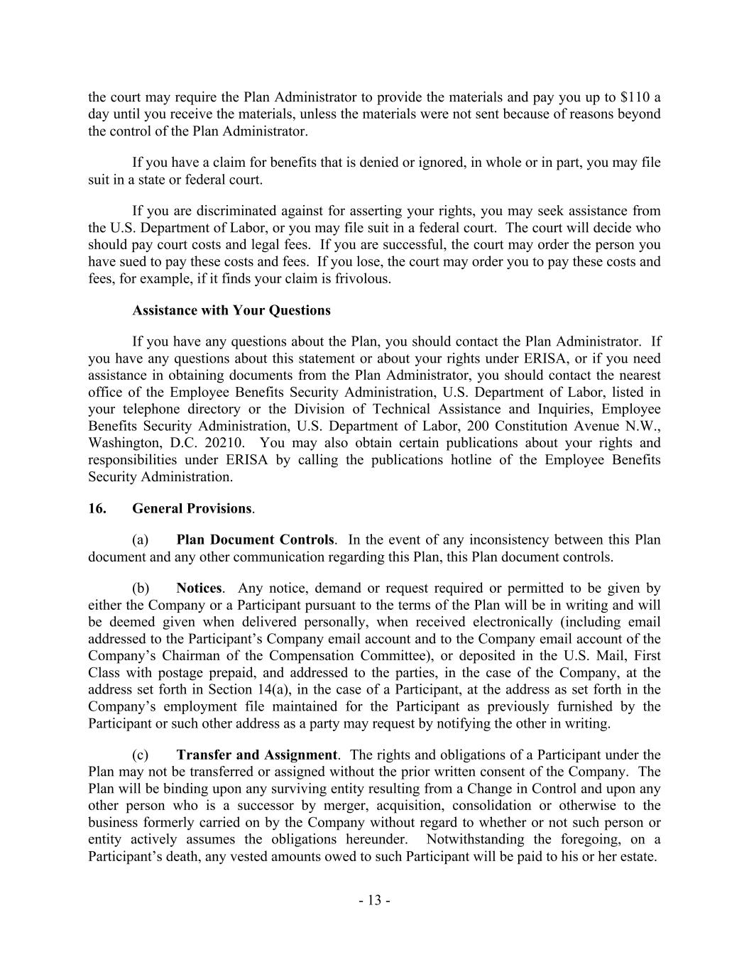 - 13 - the court may require the Plan Administrator to provide the materials and pay you up to $110 a day until you receive the materials, unless the materials were not sent because of reasons beyond the control of the Plan Administrator. If you have a claim for benefits that is denied or ignored, in whole or in part, you may file suit in a state or federal court. If you are discriminated against for asserting your rights, you may seek assistance from the U.S. Department of Labor, or you may file suit in a federal court. The court will decide who should pay court costs and legal fees. If you are successful, the court may order the person you have sued to pay these costs and fees. If you lose, the court may order you to pay these costs and fees, for example, if it finds your claim is frivolous. Assistance with Your Questions If you have any questions about the Plan, you should contact the Plan Administrator. If you have any questions about this statement or about your rights under ERISA, or if you need assistance in obtaining documents from the Plan Administrator, you should contact the nearest office of the Employee Benefits Security Administration, U.S. Department of Labor, listed in your telephone directory or the Division of Technical Assistance and Inquiries, Employee Benefits Security Administration, U.S. Department of Labor, 200 Constitution Avenue N.W., Washington, D.C. 20210. You may also obtain certain publications about your rights and responsibilities under ERISA by calling the publications hotline of the Employee Benefits Security Administration. 16. General Provisions. (a) Plan Document Controls. In the event of any inconsistency between this Plan document and any other communication regarding this Plan, this Plan document controls. (b) Notices. Any notice, demand or request required or permitted to be given by either the Company or a Participant pursuant to the terms of the Plan will be in writing and will be deemed given when delivered personally, when received electronically (including email addressed to the Participant’s Company email account and to the Company email account of the Company’s Chairman of the Compensation Committee), or deposited in the U.S. Mail, First Class with postage prepaid, and addressed to the parties, in the case of the Company, at the address set forth in Section 14(a), in the case of a Participant, at the address as set forth in the Company’s employment file maintained for the Participant as previously furnished by the Participant or such other address as a party may request by notifying the other in writing. (c) Transfer and Assignment. The rights and obligations of a Participant under the Plan may not be transferred or assigned without the prior written consent of the Company. The Plan will be binding upon any surviving entity resulting from a Change in Control and upon any other person who is a successor by merger, acquisition, consolidation or otherwise to the business formerly carried on by the Company without regard to whether or not such person or entity actively assumes the obligations hereunder. Notwithstanding the foregoing, on a Participant’s death, any vested amounts owed to such Participant will be paid to his or her estate.