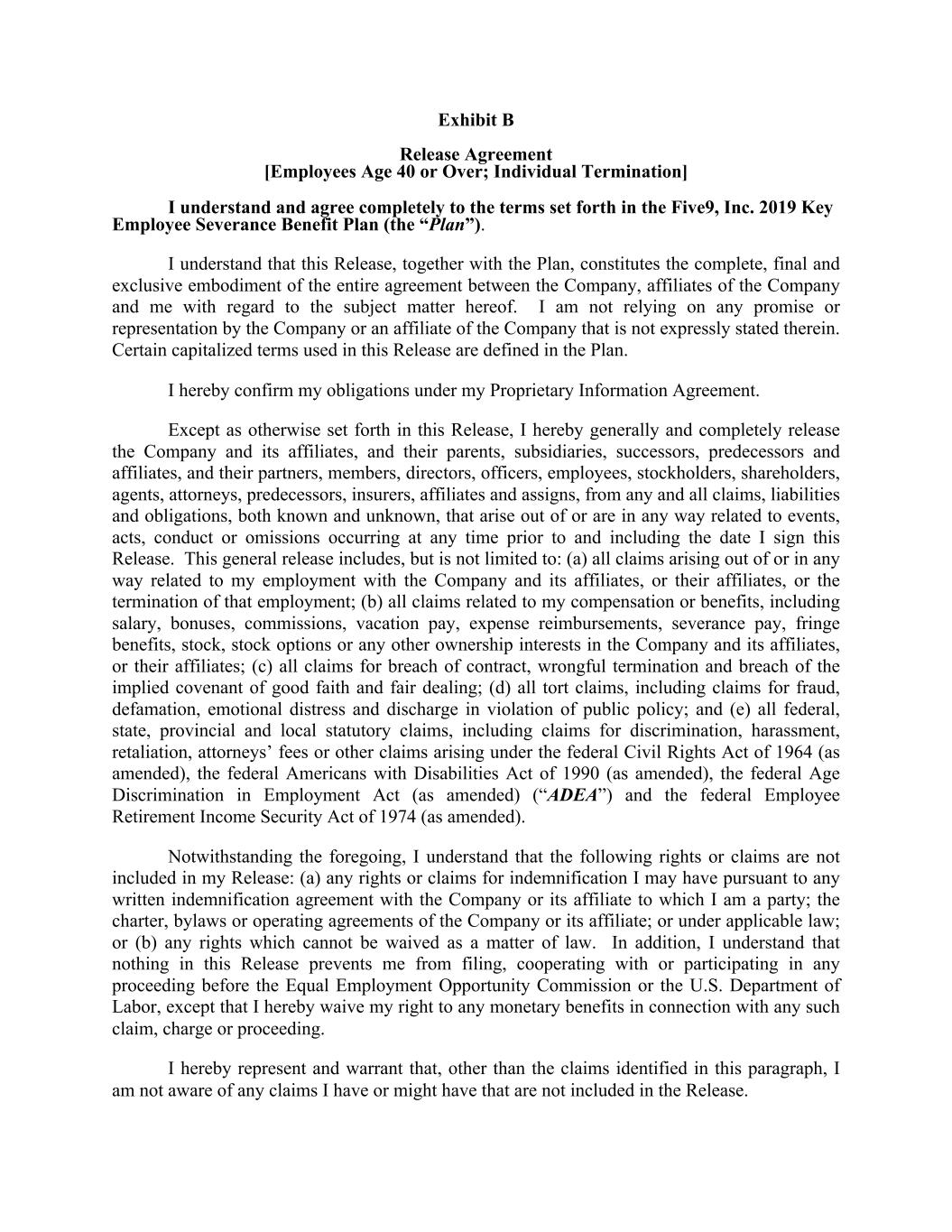 Exhibit B Release Agreement [Employees Age 40 or Over; Individual Termination] I understand and agree completely to the terms set forth in the Five9, Inc. 2019 Key Employee Severance Benefit Plan (the “Plan”). I understand that this Release, together with the Plan, constitutes the complete, final and exclusive embodiment of the entire agreement between the Company, affiliates of the Company and me with regard to the subject matter hereof. I am not relying on any promise or representation by the Company or an affiliate of the Company that is not expressly stated therein. Certain capitalized terms used in this Release are defined in the Plan. I hereby confirm my obligations under my Proprietary Information Agreement. Except as otherwise set forth in this Release, I hereby generally and completely release the Company and its affiliates, and their parents, subsidiaries, successors, predecessors and affiliates, and their partners, members, directors, officers, employees, stockholders, shareholders, agents, attorneys, predecessors, insurers, affiliates and assigns, from any and all claims, liabilities and obligations, both known and unknown, that arise out of or are in any way related to events, acts, conduct or omissions occurring at any time prior to and including the date I sign this Release. This general release includes, but is not limited to: (a) all claims arising out of or in any way related to my employment with the Company and its affiliates, or their affiliates, or the termination of that employment; (b) all claims related to my compensation or benefits, including salary, bonuses, commissions, vacation pay, expense reimbursements, severance pay, fringe benefits, stock, stock options or any other ownership interests in the Company and its affiliates, or their affiliates; (c) all claims for breach of contract, wrongful termination and breach of the implied covenant of good faith and fair dealing; (d) all tort claims, including claims for fraud, defamation, emotional distress and discharge in violation of public policy; and (e) all federal, state, provincial and local statutory claims, including claims for discrimination, harassment, retaliation, attorneys’ fees or other claims arising under the federal Civil Rights Act of 1964 (as amended), the federal Americans with Disabilities Act of 1990 (as amended), the federal Age Discrimination in Employment Act (as amended) (“ADEA”) and the federal Employee Retirement Income Security Act of 1974 (as amended). Notwithstanding the foregoing, I understand that the following rights or claims are not included in my Release: (a) any rights or claims for indemnification I may have pursuant to any written indemnification agreement with the Company or its affiliate to which I am a party; the charter, bylaws or operating agreements of the Company or its affiliate; or under applicable law; or (b) any rights which cannot be waived as a matter of law. In addition, I understand that nothing in this Release prevents me from filing, cooperating with or participating in any proceeding before the Equal Employment Opportunity Commission or the U.S. Department of Labor, except that I hereby waive my right to any monetary benefits in connection with any such claim, charge or proceeding. I hereby represent and warrant that, other than the claims identified in this paragraph, I am not aware of any claims I have or might have that are not included in the Release.