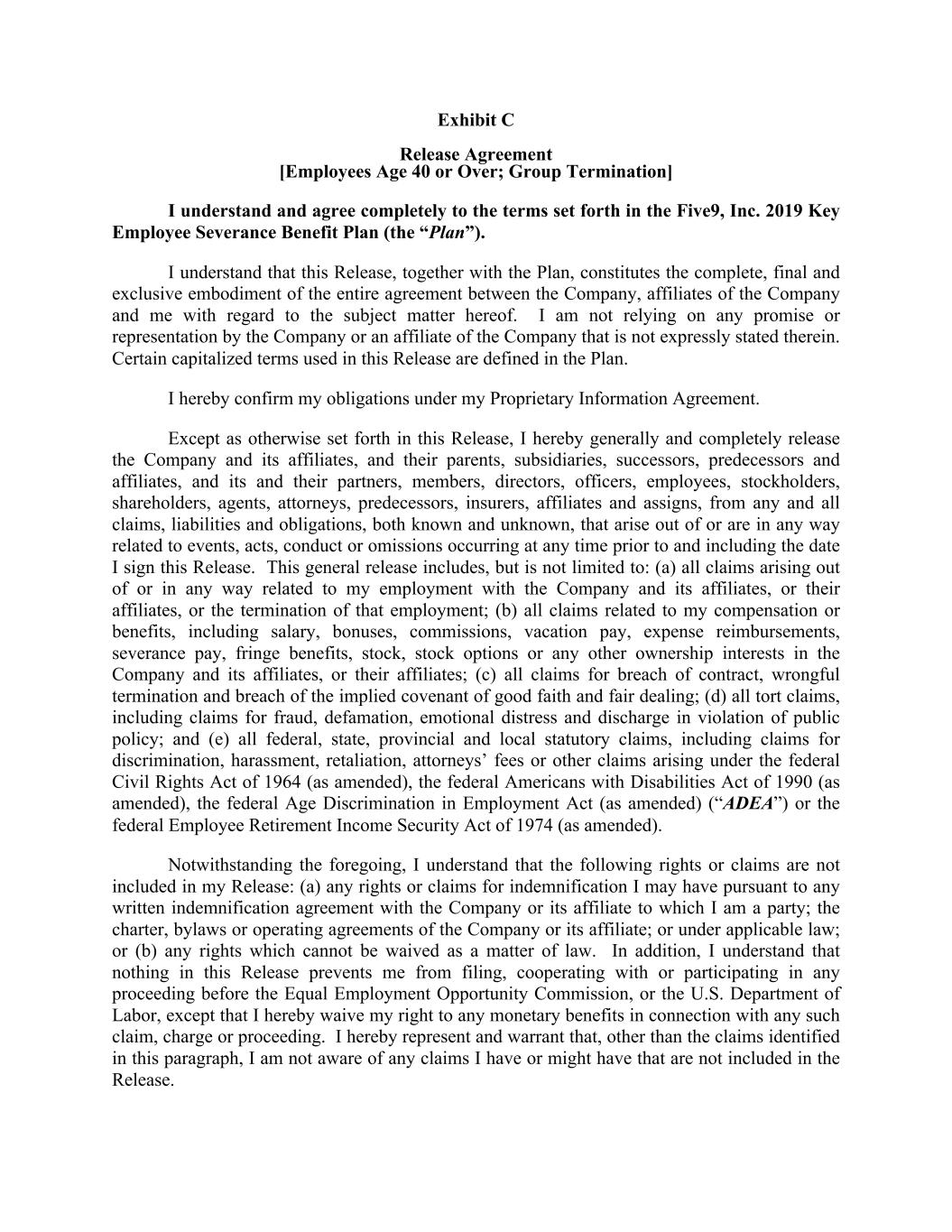 Exhibit C Release Agreement [Employees Age 40 or Over; Group Termination] I understand and agree completely to the terms set forth in the Five9, Inc. 2019 Key Employee Severance Benefit Plan (the “Plan”). I understand that this Release, together with the Plan, constitutes the complete, final and exclusive embodiment of the entire agreement between the Company, affiliates of the Company and me with regard to the subject matter hereof. I am not relying on any promise or representation by the Company or an affiliate of the Company that is not expressly stated therein. Certain capitalized terms used in this Release are defined in the Plan. I hereby confirm my obligations under my Proprietary Information Agreement. Except as otherwise set forth in this Release, I hereby generally and completely release the Company and its affiliates, and their parents, subsidiaries, successors, predecessors and affiliates, and its and their partners, members, directors, officers, employees, stockholders, shareholders, agents, attorneys, predecessors, insurers, affiliates and assigns, from any and all claims, liabilities and obligations, both known and unknown, that arise out of or are in any way related to events, acts, conduct or omissions occurring at any time prior to and including the date I sign this Release. This general release includes, but is not limited to: (a) all claims arising out of or in any way related to my employment with the Company and its affiliates, or their affiliates, or the termination of that employment; (b) all claims related to my compensation or benefits, including salary, bonuses, commissions, vacation pay, expense reimbursements, severance pay, fringe benefits, stock, stock options or any other ownership interests in the Company and its affiliates, or their affiliates; (c) all claims for breach of contract, wrongful termination and breach of the implied covenant of good faith and fair dealing; (d) all tort claims, including claims for fraud, defamation, emotional distress and discharge in violation of public policy; and (e) all federal, state, provincial and local statutory claims, including claims for discrimination, harassment, retaliation, attorneys’ fees or other claims arising under the federal Civil Rights Act of 1964 (as amended), the federal Americans with Disabilities Act of 1990 (as amended), the federal Age Discrimination in Employment Act (as amended) (“ADEA”) or the federal Employee Retirement Income Security Act of 1974 (as amended). Notwithstanding the foregoing, I understand that the following rights or claims are not included in my Release: (a) any rights or claims for indemnification I may have pursuant to any written indemnification agreement with the Company or its affiliate to which I am a party; the charter, bylaws or operating agreements of the Company or its affiliate; or under applicable law; or (b) any rights which cannot be waived as a matter of law. In addition, I understand that nothing in this Release prevents me from filing, cooperating with or participating in any proceeding before the Equal Employment Opportunity Commission, or the U.S. Department of Labor, except that I hereby waive my right to any monetary benefits in connection with any such claim, charge or proceeding. I hereby represent and warrant that, other than the claims identified in this paragraph, I am not aware of any claims I have or might have that are not included in the Release.