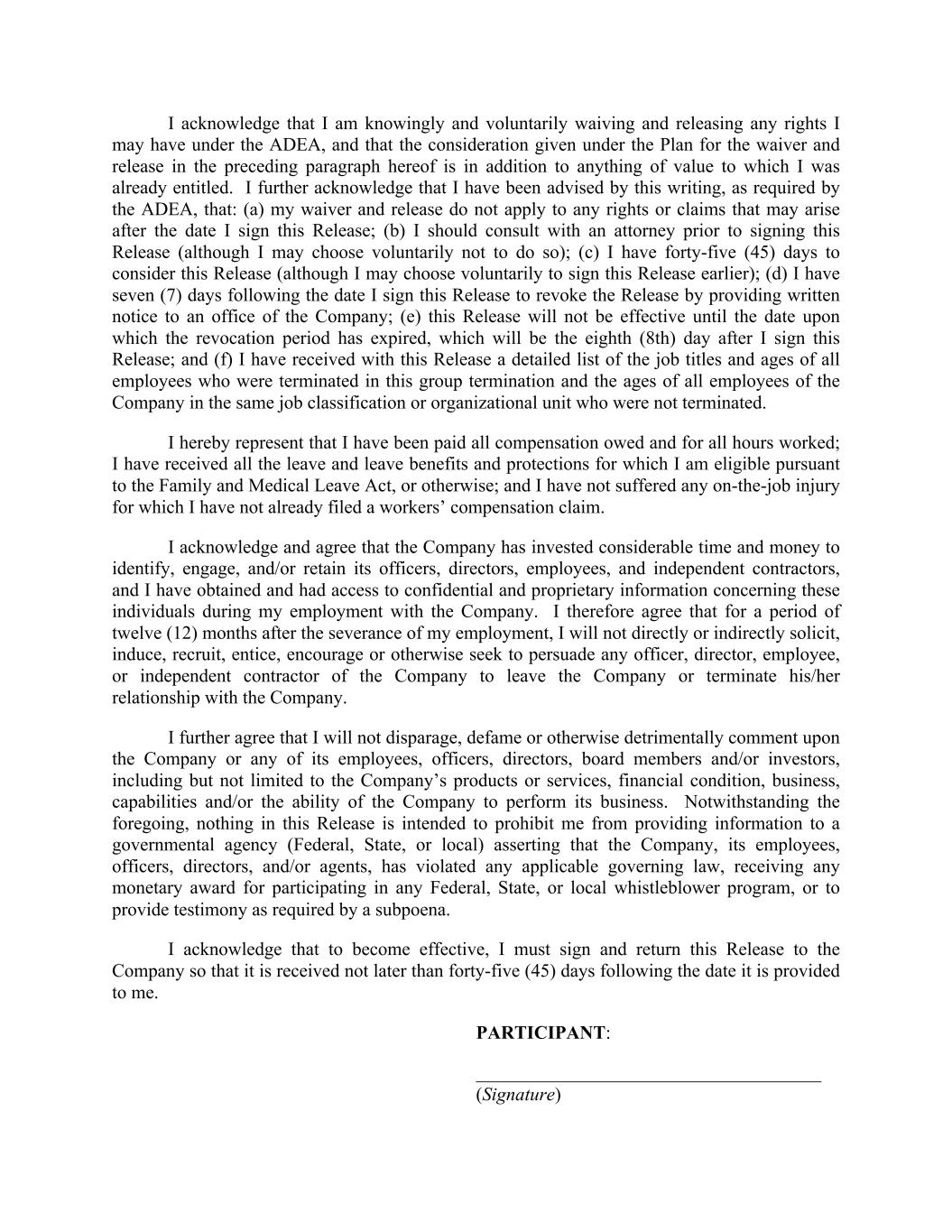 I acknowledge that I am knowingly and voluntarily waiving and releasing any rights I may have under the ADEA, and that the consideration given under the Plan for the waiver and release in the preceding paragraph hereof is in addition to anything of value to which I was already entitled. I further acknowledge that I have been advised by this writing, as required by the ADEA, that: (a) my waiver and release do not apply to any rights or claims that may arise after the date I sign this Release; (b) I should consult with an attorney prior to signing this Release (although I may choose voluntarily not to do so); (c) I have forty-five (45) days to consider this Release (although I may choose voluntarily to sign this Release earlier); (d) I have seven (7) days following the date I sign this Release to revoke the Release by providing written notice to an office of the Company; (e) this Release will not be effective until the date upon which the revocation period has expired, which will be the eighth (8th) day after I sign this Release; and (f) I have received with this Release a detailed list of the job titles and ages of all employees who were terminated in this group termination and the ages of all employees of the Company in the same job classification or organizational unit who were not terminated. I hereby represent that I have been paid all compensation owed and for all hours worked; I have received all the leave and leave benefits and protections for which I am eligible pursuant to the Family and Medical Leave Act, or otherwise; and I have not suffered any on-the-job injury for which I have not already filed a workers’ compensation claim. I acknowledge and agree that the Company has invested considerable time and money to identify, engage, and/or retain its officers, directors, employees, and independent contractors, and I have obtained and had access to confidential and proprietary information concerning these individuals during my employment with the Company. I therefore agree that for a period of twelve (12) months after the severance of my employment, I will not directly or indirectly solicit, induce, recruit, entice, encourage or otherwise seek to persuade any officer, director, employee, or independent contractor of the Company to leave the Company or terminate his/her relationship with the Company. I further agree that I will not disparage, defame or otherwise detrimentally comment upon the Company or any of its employees, officers, directors, board members and/or investors, including but not limited to the Company’s products or services, financial condition, business, capabilities and/or the ability of the Company to perform its business. Notwithstanding the foregoing, nothing in this Release is intended to prohibit me from providing information to a governmental agency (Federal, State, or local) asserting that the Company, its employees, officers, directors, and/or agents, has violated any applicable governing law, receiving any monetary award for participating in any Federal, State, or local whistleblower program, or to provide testimony as required by a subpoena. I acknowledge that to become effective, I must sign and return this Release to the Company so that it is received not later than forty-five (45) days following the date it is provided to me. PARTICIPANT: _____________________________________ (Signature)