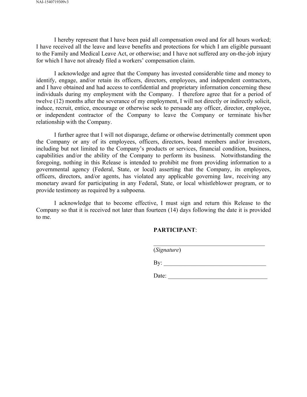 NAI-1540719309v3 I hereby represent that I have been paid all compensation owed and for all hours worked; I have received all the leave and leave benefits and protections for which I am eligible pursuant to the Family and Medical Leave Act, or otherwise; and I have not suffered any on-the-job injury for which I have not already filed a workers’ compensation claim. I acknowledge and agree that the Company has invested considerable time and money to identify, engage, and/or retain its officers, directors, employees, and independent contractors, and I have obtained and had access to confidential and proprietary information concerning these individuals during my employment with the Company. I therefore agree that for a period of twelve (12) months after the severance of my employment, I will not directly or indirectly solicit, induce, recruit, entice, encourage or otherwise seek to persuade any officer, director, employee, or independent contractor of the Company to leave the Company or terminate his/her relationship with the Company. I further agree that I will not disparage, defame or otherwise detrimentally comment upon the Company or any of its employees, officers, directors, board members and/or investors, including but not limited to the Company’s products or services, financial condition, business, capabilities and/or the ability of the Company to perform its business. Notwithstanding the foregoing, nothing in this Release is intended to prohibit me from providing information to a governmental agency (Federal, State, or local) asserting that the Company, its employees, officers, directors, and/or agents, has violated any applicable governing law, receiving any monetary award for participating in any Federal, State, or local whistleblower program, or to provide testimony as required by a subpoena. I acknowledge that to become effective, I must sign and return this Release to the Company so that it is received not later than fourteen (14) days following the date it is provided to me. PARTICIPANT: _____________________________________ (Signature) By: __________________________________ Date: _________________________________