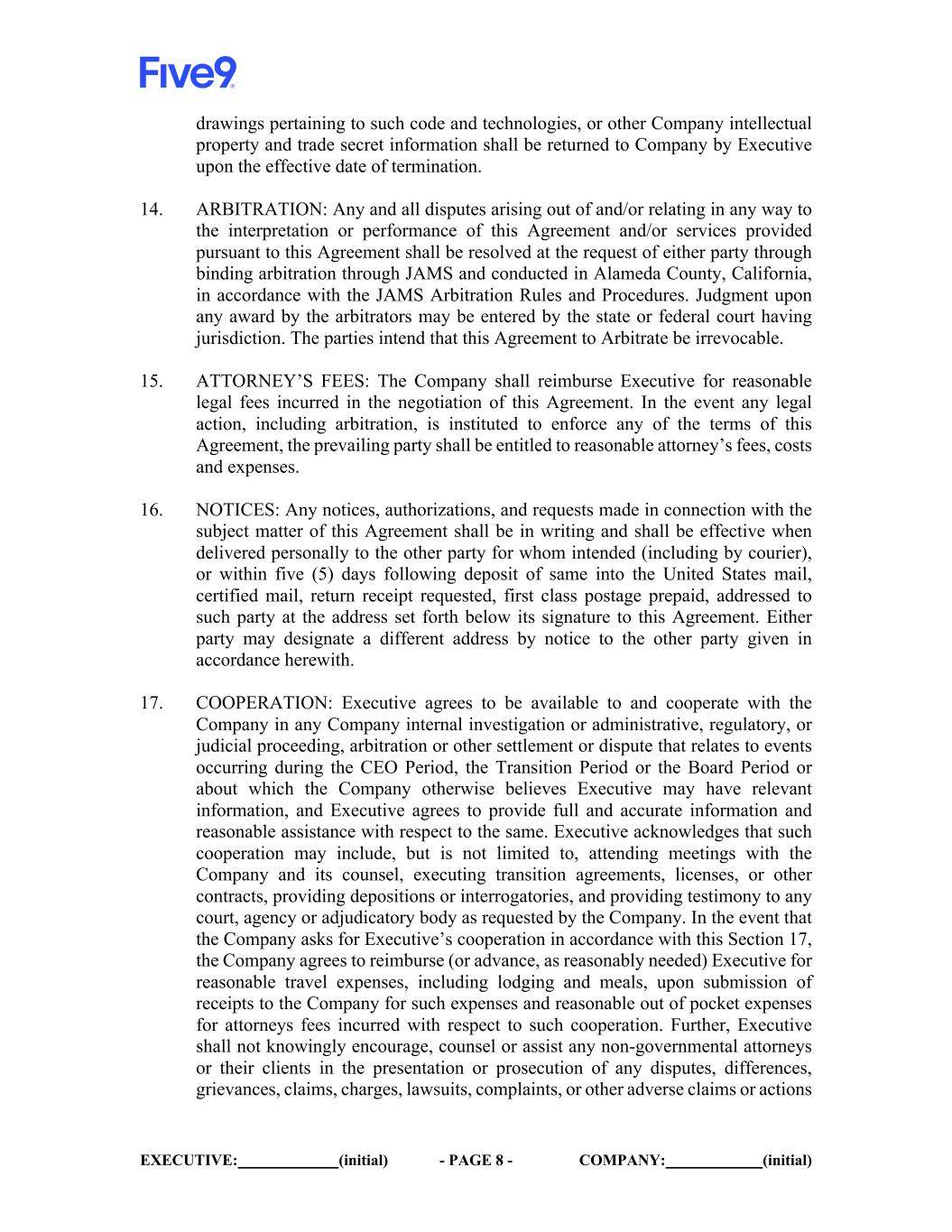 EXECUTIVE: (initial) - PAGE 8 - COMPANY: (initial) drawings pertaining to such code and technologies, or other Company intellectual property and trade secret information shall be returned to Company by Executive upon the effective date of termination. 14. ARBITRATION: Any and all disputes arising out of and/or relating in any way to the interpretation or performance of this Agreement and/or services provided pursuant to this Agreement shall be resolved at the request of either party through binding arbitration through JAMS and conducted in Alameda County, California, in accordance with the JAMS Arbitration Rules and Procedures. Judgment upon any award by the arbitrators may be entered by the state or federal court having jurisdiction. The parties intend that this Agreement to Arbitrate be irrevocable. 15. ATTORNEY’S FEES: The Company shall reimburse Executive for reasonable legal fees incurred in the negotiation of this Agreement. In the event any legal action, including arbitration, is instituted to enforce any of the terms of this Agreement, the prevailing party shall be entitled to reasonable attorney’s fees, costs and expenses. 16. NOTICES: Any notices, authorizations, and requests made in connection with the subject matter of this Agreement shall be in writing and shall be effective when delivered personally to the other party for whom intended (including by courier), or within five (5) days following deposit of same into the United States mail, certified mail, return receipt requested, first class postage prepaid, addressed to such party at the address set forth below its signature to this Agreement. Either party may designate a different address by notice to the other party given in accordance herewith. 17. COOPERATION: Executive agrees to be available to and cooperate with the Company in any Company internal investigation or administrative, regulatory, or judicial proceeding, arbitration or other settlement or dispute that relates to events occurring during the CEO Period, the Transition Period or the Board Period or about which the Company otherwise believes Executive may have relevant information, and Executive agrees to provide full and accurate information and reasonable assistance with respect to the same. Executive acknowledges that such cooperation may include, but is not limited to, attending meetings with the Company and its counsel, executing transition agreements, licenses, or other contracts, providing depositions or interrogatories, and providing testimony to any court, agency or adjudicatory body as requested by the Company. In the event that the Company asks for Executive’s cooperation in accordance with this Section 17, the Company agrees to reimburse (or advance, as reasonably needed) Executive for reasonable travel expenses, including lodging and meals, upon submission of receipts to the Company for such expenses and reasonable out of pocket expenses for attorneys fees incurred with respect to such cooperation. Further, Executive shall not knowingly encourage, counsel or assist any non-governmental attorneys or their clients in the presentation or prosecution of any disputes, differences, grievances, claims, charges, lawsuits, complaints, or other adverse claims or actions