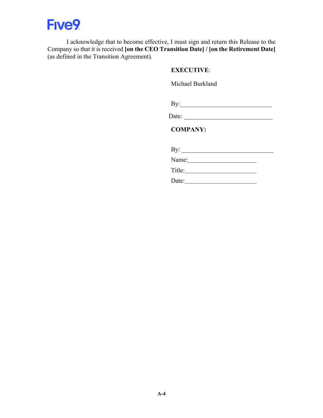 A-1 APPENDIX A Release Agreement I understand that this Release Agreement (this “Release”) constitutes the complete, final and exclusive embodiment of the entire agreement between the Company, affiliates of the Company and me with regard to the subject matter hereof. I am not relying on any promise or representation by Five9, Inc. (the “Company”) or an affiliate of the Company that is not expressly stated herein or therein. I hereby acknowledge and agree to the following: (a) My employment [as Chief Executive Officer of the Company] / [as Executive Chair of the Board of the Company] ceased effective _____________ (the “Release Date”), in connection with my voluntary retirement and I will be paid all salary due to me through the Release Date. I am not entitled to any benefits or severance under the Company’s 2019 Key Employee Severance Benefit Plan. (b) I entered in an Employment Transition Agreement (“Transition Agreement”) with the Company effective as of July 31, 2025, which provides certain benefits for services provided during the [Transition Period] / [Board Period] (as defined in the Transition Agreement); provided, however, that such benefits will not be provided unless I executive this Release and will no longer be provided if I breach the terms of this Release. I hereby confirm my obligations under the Agreement Regarding Confidential Information, Intellectual Property Non-Solicitation between me and the Company, dated as of April 16, 2012. Except as otherwise expressly set forth in this Release, I hereby generally and completely release the Company and its affiliates, and their parents, subsidiaries, successors, predecessors and affiliates, and their partners, members, directors, officers, employees, stockholders, shareholders, agents, attorneys, predecessors, insurers, affiliates and assigns (“Releasees”), from any and all claims, liabilities and obligations, both known and unknown, that arise out of or are in any way related to events, acts, conduct or omissions occurring at any time prior to and including the date I sign this Release. This general release includes, but is not limited to: (a) all claims arising out of or in any way related to my employment with the Company and its affiliates, or their affiliates, or the severance of that employment; (b) all claims related to my compensation or benefits, including salary, bonuses, commissions, vacation pay, expense reimbursements, severance pay, fringe benefits, stock, stock options or any other ownership interests in the Company and its affiliates, or their affiliates; (c) all claims for breach of contract, wrongful termination and breach of the implied covenant of good faith and fair dealing; (d) all tort claims, including claims for fraud, defamation, emotional distress and discharge in violation of public policy; and (e) all federal, state, provincial and local statutory claims, including claims for discrimination, harassment, retaliation, attorneys’ fees or other claims arising under the California Labor Code, including the Private Attorneys General Act, the