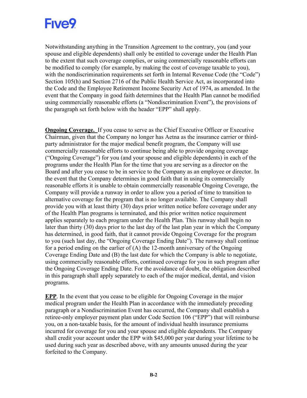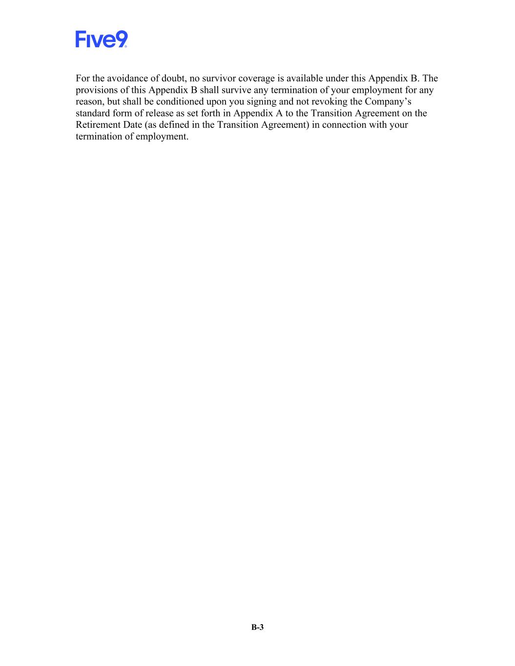 B-1 APPENDIX B Continued Health Plan Coverage Subject to the other provisions of the Employment Transition Agreement (the “Transition Agreement”), by and between you and Five9, Inc. (the “Company”) you shall be eligible to be covered under the major medical, dental and vision benefit programs that are currently or in the future sponsored by the Company (or an entity in its controlled group), and which are generally available to active employees (the “Health Plan”), during your tenure as Chief Executive Officer and Executive Chair of the Board of the Company (“Executive Chairman”). Subject to the other provisions of this Appendix B, at such time as you cease to serve as the Chief Executive Officer or Executive Chairman (whichever is latest), you shall continue to be eligible to be covered under the Health Plan as a director on the Board and/or former employee of the Company to the extent provided under the paragraph with the header “Ongoing Coverage” below, which, as you know, is a benefit that had been provided under your Offer Letter by and between you and the Company, dated as of October 10, 2022, before it was replaced with the Transition Agreement. To the extent that you are eligible to be covered under the Health Plan as set forth in this Appendix B, you can elect to cover your spouse and any eligible dependents (each as defined in the Health Plan) under the Health Plan, all in accordance with the generally applicable provisions of the Health Plan documents regarding coverage of spouses and eligible dependents. Subject to the other provisions of the Transition Agreement, from and after such time as you or a covered spouse or eligible dependent is eligible for Medicare Part A and Part B (collectively, “Medicare”), the Health Plan will pay secondary to Medicare, in accordance with the generally applicable provisions of the Health Plan documents, and without regard to whether such person is actually enrolled in Medicare Part A or Part B. The Company shall pay 100% of the cost of the Health Plan premiums for the coverage for you and your covered spouse and eligible dependents. Notwithstanding the foregoing sentence, if any program under the Health Plan becomes self-funded (in whole or in part), then for the program that is self-funded: (1) you shall pay the Company the cost of such self-funded coverage, calculated in the same manner as COBRA, for you and your covered spouse’s and eligible dependents’ coverage using your own post-tax resources and (2) such payment will be due to the Company with respect to each month of coverage within sixty (60) days of the first day of the month of coverage. For example, if the major medical plan first becomes self-funded as of January 1, 2026 and the dental and vision plans are fully-insured as of that date, you must pay the Company the cost of the January 2026 coverage under the major medical plan by February 28, 2026 and you would not owe any payment to the Company for the premiums related to the vision and dental plans for January 2026. The Company is required to inform you as soon as reasonably possible in writing if any Health Plan program is self-funded to ensure that you are aware of any obligation to pay the Company for any portion of the cost of coverage under the Health Plan.