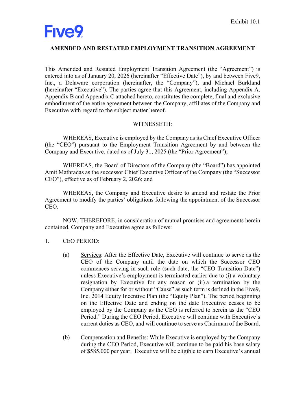 Exhibit 10.1 AMENDED AND RESTATED EMPLOYMENT TRANSITION AGREEMENT This Amended and Restated Employment Transition Agreement (the “Agreement”) is entered into as of January 20, 2026 (hereinafter “Effective Date”), by and between Five9, Inc., a Delaware corporation (hereinafter, the “Company”), and Michael Burkland (hereinafter “Executive”). The parties agree that this Agreement, including Appendix A, Appendix B and Appendix C attached hereto, constitutes the complete, final and exclusive embodiment of the entire agreement between the Company, affiliates of the Company and Executive with regard to the subject matter hereof. WITNESSETH: WHEREAS, Executive is employed by the Company as its Chief Executive Officer (the “CEO”) pursuant to the Employment Transition Agreement by and between the Company and Executive, dated as of July 31, 2025 (the “Prior Agreement”); WHEREAS, the Board of Directors of the Company (the “Board”) has appointed Amit Mathradas as the successor Chief Executive Officer of the Company (the “Successor CEO”), effective as of February 2, 2026; and WHEREAS, the Company and Executive desire to amend and restate the Prior Agreement to modify the parties’ obligations following the appointment of the Successor CEO. NOW, THEREFORE, in consideration of mutual promises and agreements herein contained, Company and Executive agree as follows: 1. CEO PERIOD: (a) Services: After the Effective Date, Executive will continue to serve as the CEO of the Company until the date on which the Successor CEO commences serving in such role (such date, the “CEO Transition Date”) unless Executive’s employment is terminated earlier due to (i) a voluntary resignation by Executive for any reason or (ii) a termination by the Company either for or without “Cause” as such term is defined in the Five9, Inc. 2014 Equity Incentive Plan (the “Equity Plan”). The period beginning on the Effective Date and ending on the date Executive ceases to be employed by the Company as the CEO is referred to herein as the “CEO Period.” During the CEO Period, Executive will continue with Executive’s current duties as CEO, and will continue to serve as Chairman of the Board. (b) Compensation and Benefits: While Executive is employed by the Company during the CEO Period, Executive will continue to be paid his base salary of $585,000 per year. Executive will be eligible to earn Executive’s annual