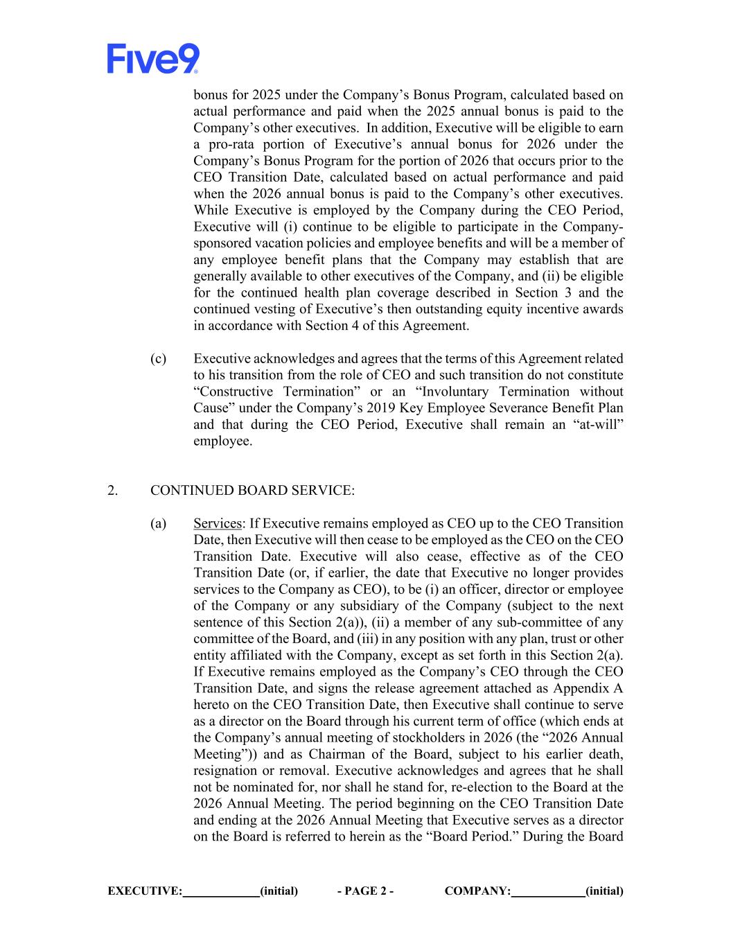 EXECUTIVE: (initial) - PAGE 2 - COMPANY: (initial) bonus for 2025 under the Company’s Bonus Program, calculated based on actual performance and paid when the 2025 annual bonus is paid to the Company’s other executives. In addition, Executive will be eligible to earn a pro-rata portion of Executive’s annual bonus for 2026 under the Company’s Bonus Program for the portion of 2026 that occurs prior to the CEO Transition Date, calculated based on actual performance and paid when the 2026 annual bonus is paid to the Company’s other executives. While Executive is employed by the Company during the CEO Period, Executive will (i) continue to be eligible to participate in the Company- sponsored vacation policies and employee benefits and will be a member of any employee benefit plans that the Company may establish that are generally available to other executives of the Company, and (ii) be eligible for the continued health plan coverage described in Section 3 and the continued vesting of Executive’s then outstanding equity incentive awards in accordance with Section 4 of this Agreement. (c) Executive acknowledges and agrees that the terms of this Agreement related to his transition from the role of CEO and such transition do not constitute “Constructive Termination” or an “Involuntary Termination without Cause” under the Company’s 2019 Key Employee Severance Benefit Plan and that during the CEO Period, Executive shall remain an “at-will” employee. 2. CONTINUED BOARD SERVICE: (a) Services: If Executive remains employed as CEO up to the CEO Transition Date, then Executive will then cease to be employed as the CEO on the CEO Transition Date. Executive will also cease, effective as of the CEO Transition Date (or, if earlier, the date that Executive no longer provides services to the Company as CEO), to be (i) an officer, director or employee of the Company or any subsidiary of the Company (subject to the next sentence of this Section 2(a)), (ii) a member of any sub-committee of any committee of the Board, and (iii) in any position with any plan, trust or other entity affiliated with the Company, except as set forth in this Section 2(a). If Executive remains employed as the Company’s CEO through the CEO Transition Date, and signs the release agreement attached as Appendix A hereto on the CEO Transition Date, then Executive shall continue to serve as a director on the Board through his current term of office (which ends at the Company’s annual meeting of stockholders in 2026 (the “2026 Annual Meeting”)) and as Chairman of the Board, subject to his earlier death, resignation or removal. Executive acknowledges and agrees that he shall not be nominated for, nor shall he stand for, re-election to the Board at the 2026 Annual Meeting. The period beginning on the CEO Transition Date and ending at the 2026 Annual Meeting that Executive serves as a director on the Board is referred to herein as the “Board Period.” During the Board