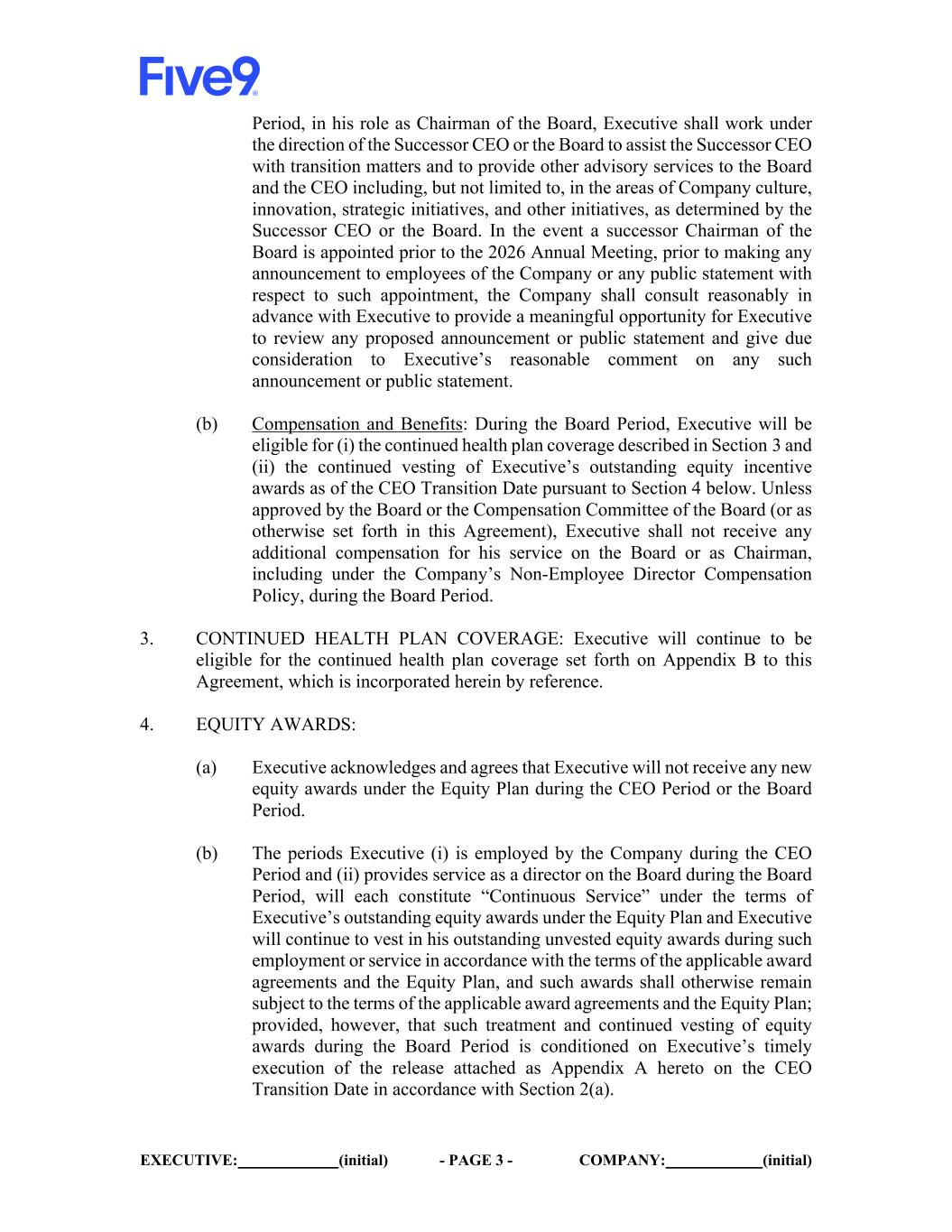 EXECUTIVE: (initial) - PAGE 3 - COMPANY: (initial) Period, in his role as Chairman of the Board, Executive shall work under the direction of the Successor CEO or the Board to assist the Successor CEO with transition matters and to provide other advisory services to the Board and the CEO including, but not limited to, in the areas of Company culture, innovation, strategic initiatives, and other initiatives, as determined by the Successor CEO or the Board. In the event a successor Chairman of the Board is appointed prior to the 2026 Annual Meeting, prior to making any announcement to employees of the Company or any public statement with respect to such appointment, the Company shall consult reasonably in advance with Executive to provide a meaningful opportunity for Executive to review any proposed announcement or public statement and give due consideration to Executive’s reasonable comment on any such announcement or public statement. (b) Compensation and Benefits: During the Board Period, Executive will be eligible for (i) the continued health plan coverage described in Section 3 and (ii) the continued vesting of Executive’s outstanding equity incentive awards as of the CEO Transition Date pursuant to Section 4 below. Unless approved by the Board or the Compensation Committee of the Board (or as otherwise set forth in this Agreement), Executive shall not receive any additional compensation for his service on the Board or as Chairman, including under the Company’s Non-Employee Director Compensation Policy, during the Board Period. 3. CONTINUED HEALTH PLAN COVERAGE: Executive will continue to be eligible for the continued health plan coverage set forth on Appendix B to this Agreement, which is incorporated herein by reference. 4. EQUITY AWARDS: (a) Executive acknowledges and agrees that Executive will not receive any new equity awards under the Equity Plan during the CEO Period or the Board Period. (b) The periods Executive (i) is employed by the Company during the CEO Period and (ii) provides service as a director on the Board during the Board Period, will each constitute “Continuous Service” under the terms of Executive’s outstanding equity awards under the Equity Plan and Executive will continue to vest in his outstanding unvested equity awards during such employment or service in accordance with the terms of the applicable award agreements and the Equity Plan, and such awards shall otherwise remain subject to the terms of the applicable award agreements and the Equity Plan; provided, however, that such treatment and continued vesting of equity awards during the Board Period is conditioned on Executive’s timely execution of the release attached as Appendix A hereto on the CEO Transition Date in accordance with Section 2(a).
