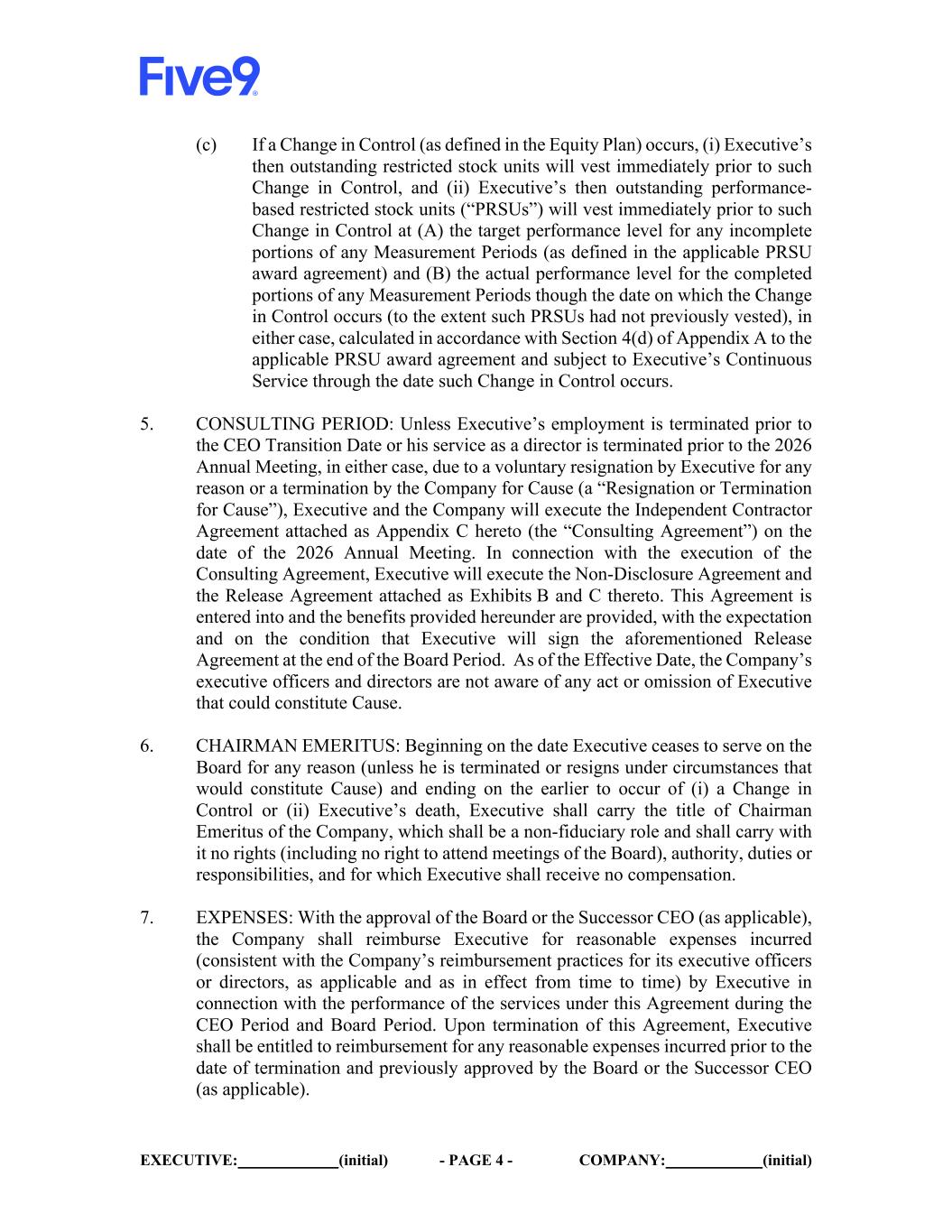 EXECUTIVE: (initial) - PAGE 4 - COMPANY: (initial) (c) If a Change in Control (as defined in the Equity Plan) occurs, (i) Executive’s then outstanding restricted stock units will vest immediately prior to such Change in Control, and (ii) Executive’s then outstanding performance- based restricted stock units (“PRSUs”) will vest immediately prior to such Change in Control at (A) the target performance level for any incomplete portions of any Measurement Periods (as defined in the applicable PRSU award agreement) and (B) the actual performance level for the completed portions of any Measurement Periods though the date on which the Change in Control occurs (to the extent such PRSUs had not previously vested), in either case, calculated in accordance with Section 4(d) of Appendix A to the applicable PRSU award agreement and subject to Executive’s Continuous Service through the date such Change in Control occurs. 5. CONSULTING PERIOD: Unless Executive’s employment is terminated prior to the CEO Transition Date or his service as a director is terminated prior to the 2026 Annual Meeting, in either case, due to a voluntary resignation by Executive for any reason or a termination by the Company for Cause (a “Resignation or Termination for Cause”), Executive and the Company will execute the Independent Contractor Agreement attached as Appendix C hereto (the “Consulting Agreement”) on the date of the 2026 Annual Meeting. In connection with the execution of the Consulting Agreement, Executive will execute the Non-Disclosure Agreement and the Release Agreement attached as Exhibits B and C thereto. This Agreement is entered into and the benefits provided hereunder are provided, with the expectation and on the condition that Executive will sign the aforementioned Release Agreement at the end of the Board Period. As of the Effective Date, the Company’s executive officers and directors are not aware of any act or omission of Executive that could constitute Cause. 6. CHAIRMAN EMERITUS: Beginning on the date Executive ceases to serve on the Board for any reason (unless he is terminated or resigns under circumstances that would constitute Cause) and ending on the earlier to occur of (i) a Change in Control or (ii) Executive’s death, Executive shall carry the title of Chairman Emeritus of the Company, which shall be a non-fiduciary role and shall carry with it no rights (including no right to attend meetings of the Board), authority, duties or responsibilities, and for which Executive shall receive no compensation. 7. EXPENSES: With the approval of the Board or the Successor CEO (as applicable), the Company shall reimburse Executive for reasonable expenses incurred (consistent with the Company’s reimbursement practices for its executive officers or directors, as applicable and as in effect from time to time) by Executive in connection with the performance of the services under this Agreement during the CEO Period and Board Period. Upon termination of this Agreement, Executive shall be entitled to reimbursement for any reasonable expenses incurred prior to the date of termination and previously approved by the Board or the Successor CEO (as applicable).