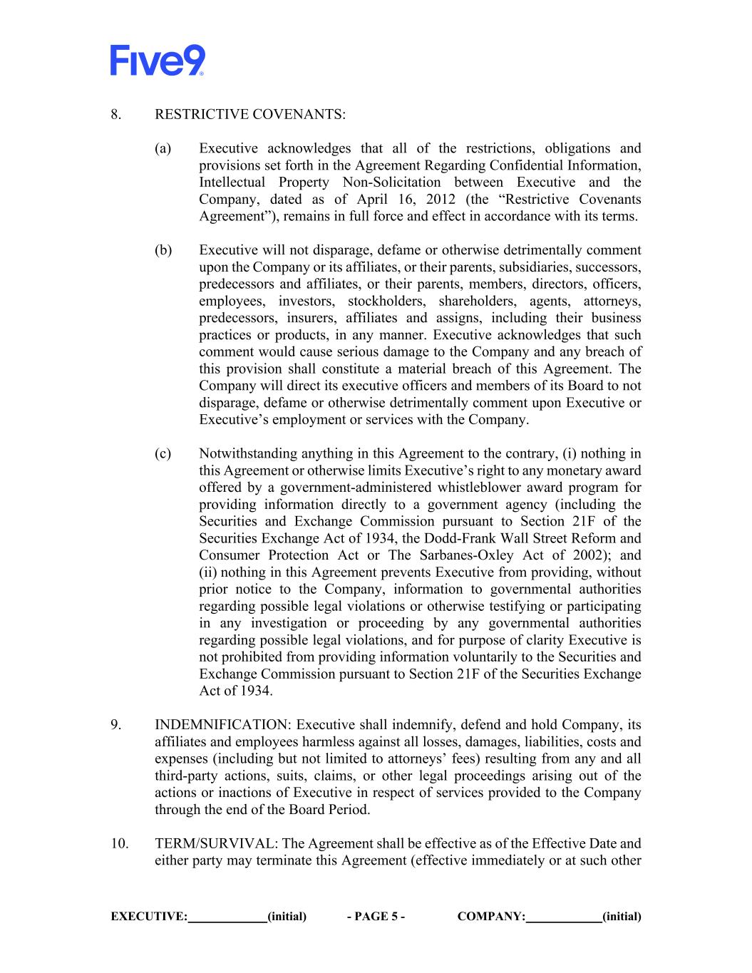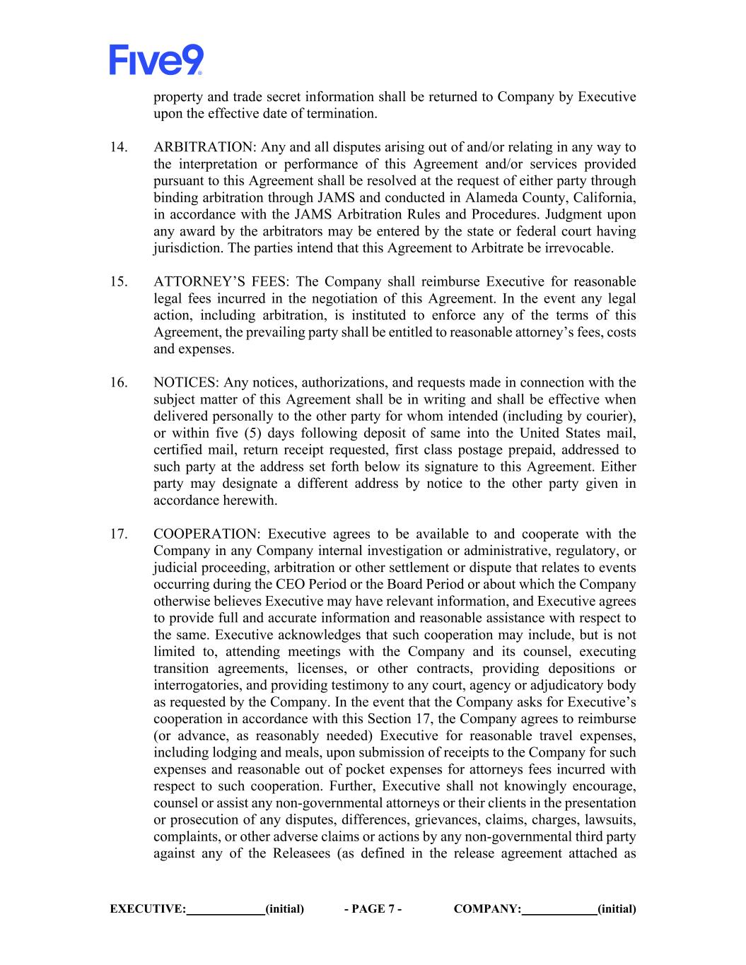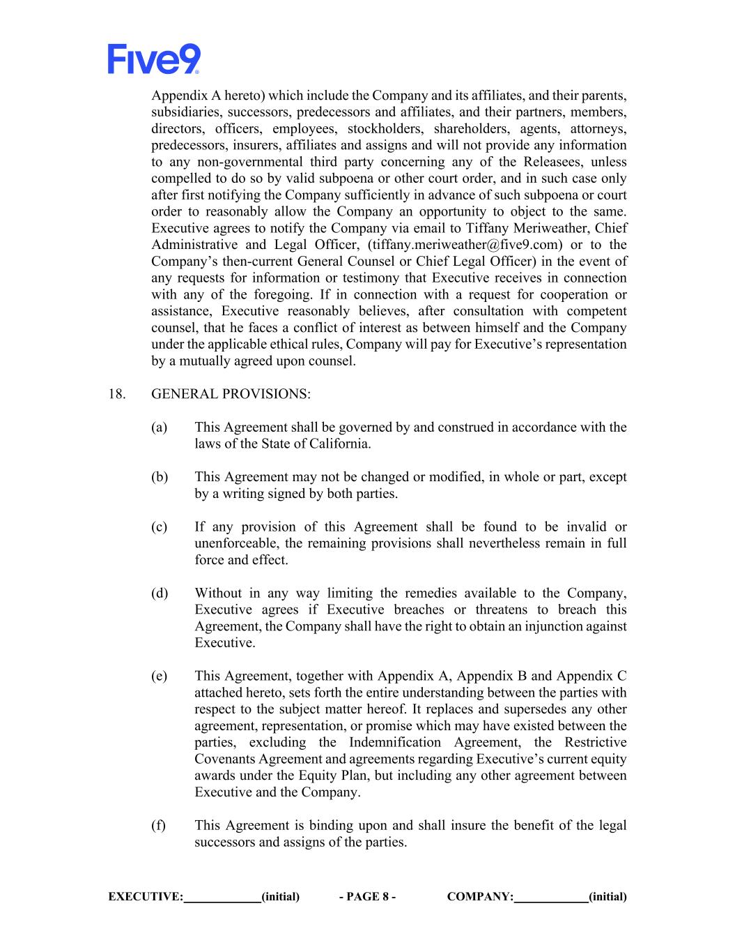 EXECUTIVE: (initial) - PAGE 8 - COMPANY: (initial) Appendix A hereto) which include the Company and its affiliates, and their parents, subsidiaries, successors, predecessors and affiliates, and their partners, members, directors, officers, employees, stockholders, shareholders, agents, attorneys, predecessors, insurers, affiliates and assigns and will not provide any information to any non-governmental third party concerning any of the Releasees, unless compelled to do so by valid subpoena or other court order, and in such case only after first notifying the Company sufficiently in advance of such subpoena or court order to reasonably allow the Company an opportunity to object to the same. Executive agrees to notify the Company via email to Tiffany Meriweather, Chief Administrative and Legal Officer, (tiffany.meriweather@five9.com) or to the Company’s then-current General Counsel or Chief Legal Officer) in the event of any requests for information or testimony that Executive receives in connection with any of the foregoing. If in connection with a request for cooperation or assistance, Executive reasonably believes, after consultation with competent counsel, that he faces a conflict of interest as between himself and the Company under the applicable ethical rules, Company will pay for Executive’s representation by a mutually agreed upon counsel. 18. GENERAL PROVISIONS: (a) This Agreement shall be governed by and construed in accordance with the laws of the State of California. (b) This Agreement may not be changed or modified, in whole or part, except by a writing signed by both parties. (c) If any provision of this Agreement shall be found to be invalid or unenforceable, the remaining provisions shall nevertheless remain in full force and effect. (d) Without in any way limiting the remedies available to the Company, Executive agrees if Executive breaches or threatens to breach this Agreement, the Company shall have the right to obtain an injunction against Executive. (e) This Agreement, together with Appendix A, Appendix B and Appendix C attached hereto, sets forth the entire understanding between the parties with respect to the subject matter hereof. It replaces and supersedes any other agreement, representation, or promise which may have existed between the parties, excluding the Indemnification Agreement, the Restrictive Covenants Agreement and agreements regarding Executive’s current equity awards under the Equity Plan, but including any other agreement between Executive and the Company. (f) This Agreement is binding upon and shall insure the benefit of the legal successors and assigns of the parties.