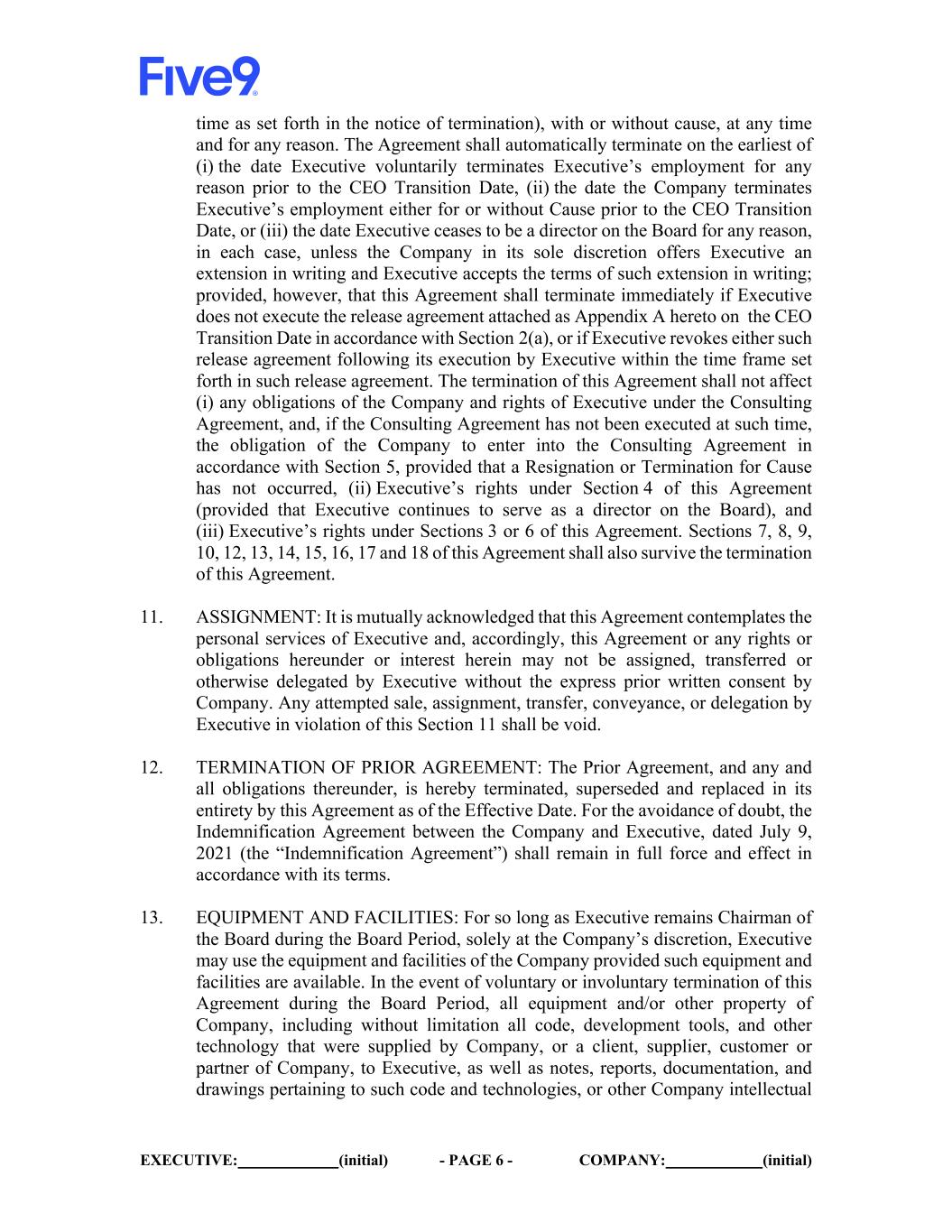 EXECUTIVE: (initial) - PAGE 6 - COMPANY: (initial) time as set forth in the notice of termination), with or without cause, at any time and for any reason. The Agreement shall automatically terminate on the earliest of (i) the date Executive voluntarily terminates Executive’s employment for any reason prior to the CEO Transition Date, (ii) the date the Company terminates Executive’s employment either for or without Cause prior to the CEO Transition Date, or (iii) the date Executive ceases to be a director on the Board for any reason, in each case, unless the Company in its sole discretion offers Executive an extension in writing and Executive accepts the terms of such extension in writing; provided, however, that this Agreement shall terminate immediately if Executive does not execute the release agreement attached as Appendix A hereto on the CEO Transition Date in accordance with Section 2(a), or if Executive revokes either such release agreement following its execution by Executive within the time frame set forth in such release agreement. The termination of this Agreement shall not affect (i) any obligations of the Company and rights of Executive under the Consulting Agreement, and, if the Consulting Agreement has not been executed at such time, the obligation of the Company to enter into the Consulting Agreement in accordance with Section 5, provided that a Resignation or Termination for Cause has not occurred, (ii) Executive’s rights under Section 4 of this Agreement (provided that Executive continues to serve as a director on the Board), and (iii) Executive’s rights under Sections 3 or 6 of this Agreement. Sections 7, 8, 9, 10, 12, 13, 14, 15, 16, 17 and 18 of this Agreement shall also survive the termination of this Agreement. 11. ASSIGNMENT: It is mutually acknowledged that this Agreement contemplates the personal services of Executive and, accordingly, this Agreement or any rights or obligations hereunder or interest herein may not be assigned, transferred or otherwise delegated by Executive without the express prior written consent by Company. Any attempted sale, assignment, transfer, conveyance, or delegation by Executive in violation of this Section 11 shall be void. 12. TERMINATION OF PRIOR AGREEMENT: The Prior Agreement, and any and all obligations thereunder, is hereby terminated, superseded and replaced in its entirety by this Agreement as of the Effective Date. For the avoidance of doubt, the Indemnification Agreement between the Company and Executive, dated July 9, 2021 (the “Indemnification Agreement”) shall remain in full force and effect in accordance with its terms. 13. EQUIPMENT AND FACILITIES: For so long as Executive remains Chairman of the Board during the Board Period, solely at the Company’s discretion, Executive may use the equipment and facilities of the Company provided such equipment and facilities are available. In the event of voluntary or involuntary termination of this Agreement during the Board Period, all equipment and/or other property of Company, including without limitation all code, development tools, and other technology that were supplied by Company, or a client, supplier, customer or partner of Company, to Executive, as well as notes, reports, documentation, and drawings pertaining to such code and technologies, or other Company intellectual