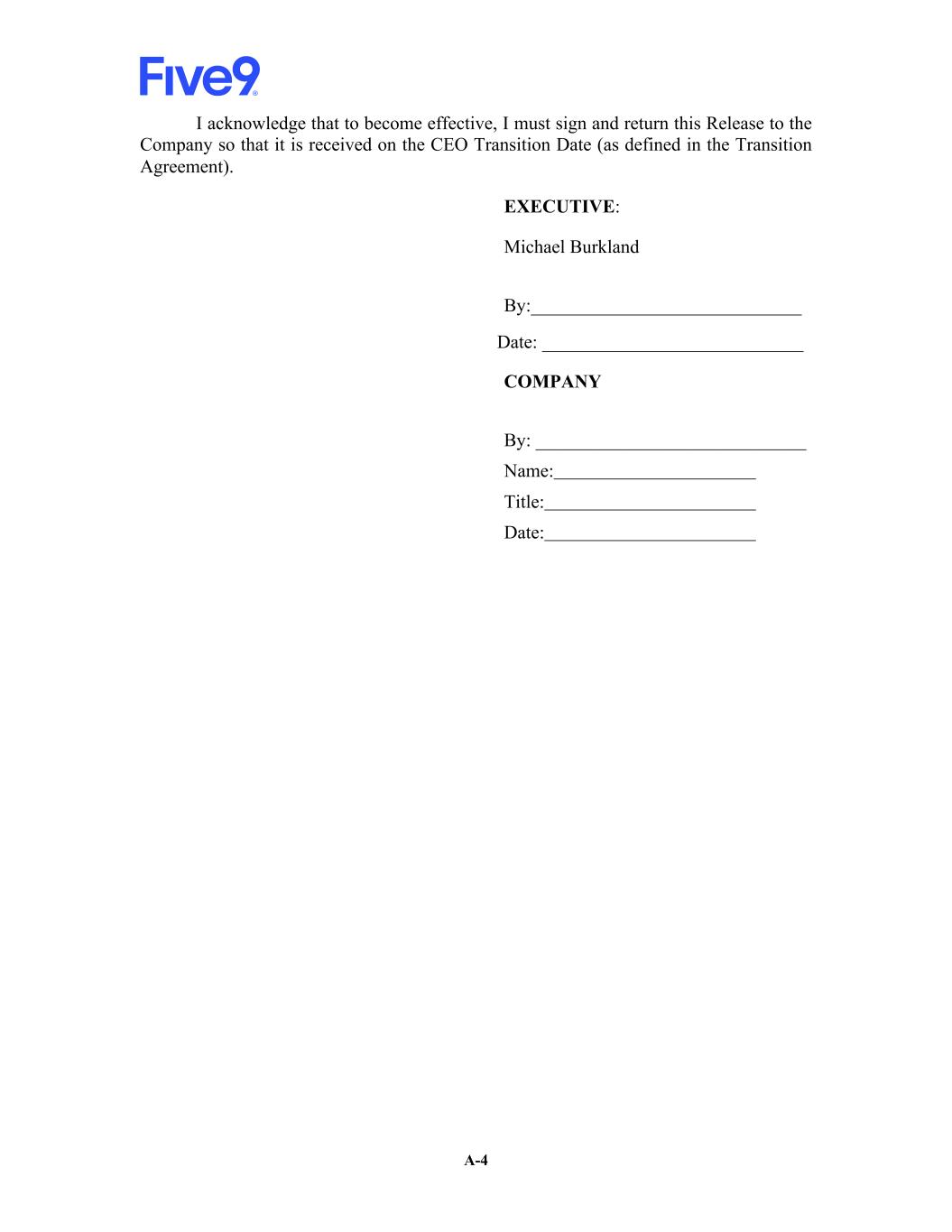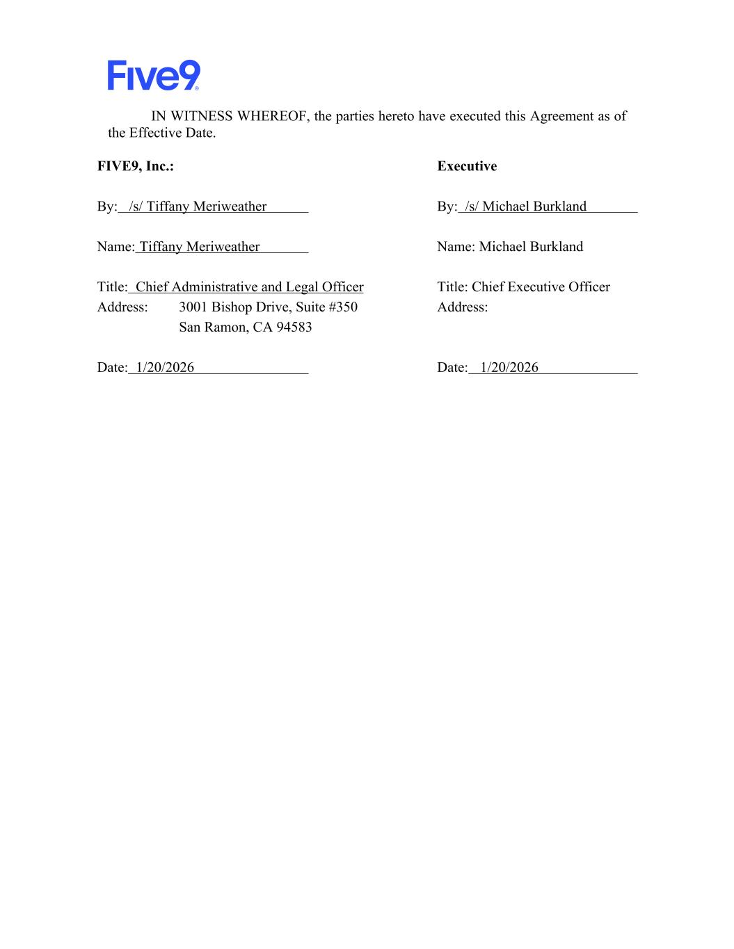 IN WITNESS WHEREOF, the parties hereto have executed this Agreement as of the Effective Date. FIVE9, Inc.: Executive By: /s/ Tiffany Meriweather By: /s/ Michael Burkland Name: Tiffany Meriweather Name: Michael Burkland Title: Chief Administrative and Legal Officer Title: Chief Executive Officer Address: 3001 Bishop Drive, Suite #350 San Ramon, CA 94583 Address: Date: 1/20/2026 Date: 1/20/2026