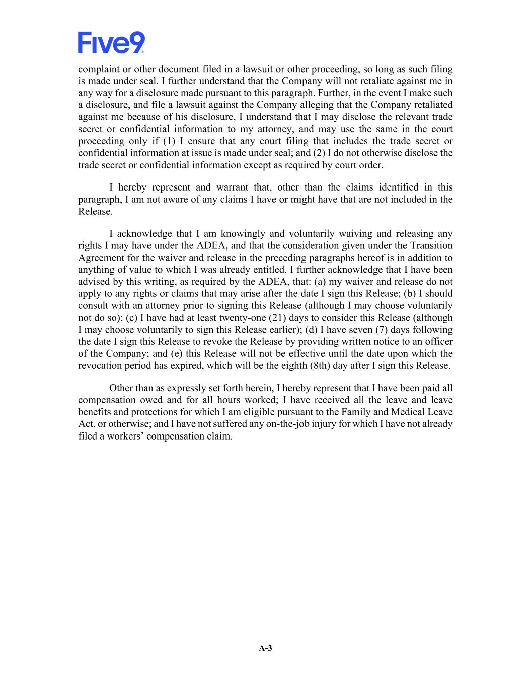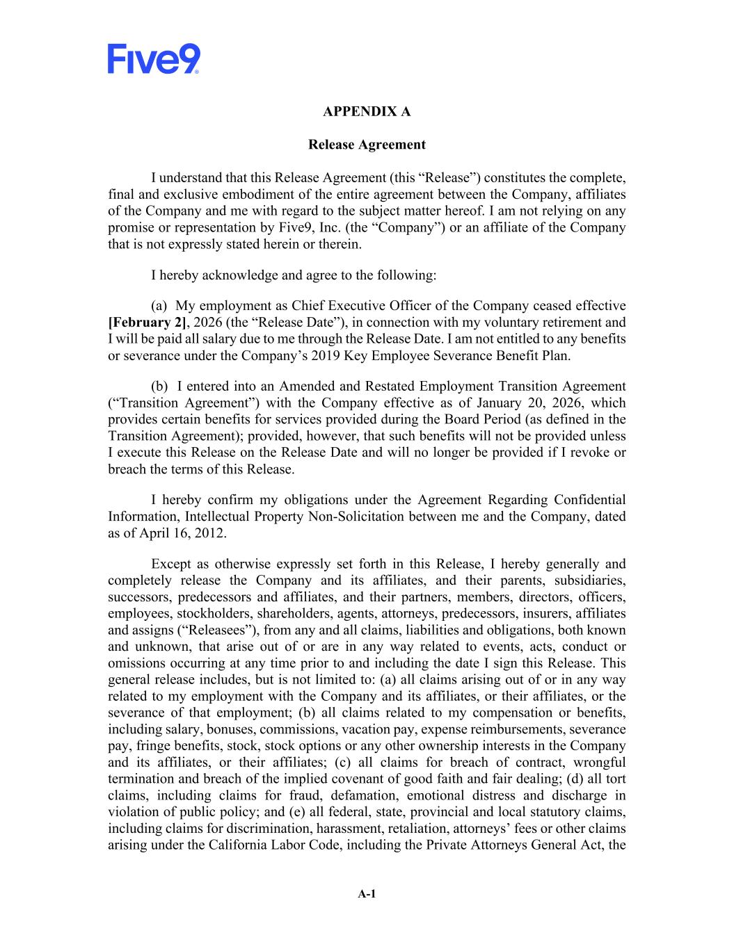 A-1 APPENDIX A Release Agreement I understand that this Release Agreement (this “Release”) constitutes the complete, final and exclusive embodiment of the entire agreement between the Company, affiliates of the Company and me with regard to the subject matter hereof. I am not relying on any promise or representation by Five9, Inc. (the “Company”) or an affiliate of the Company that is not expressly stated herein or therein. I hereby acknowledge and agree to the following: (a) My employment as Chief Executive Officer of the Company ceased effective [February 2], 2026 (the “Release Date”), in connection with my voluntary retirement and I will be paid all salary due to me through the Release Date. I am not entitled to any benefits or severance under the Company’s 2019 Key Employee Severance Benefit Plan. (b) I entered into an Amended and Restated Employment Transition Agreement (“Transition Agreement”) with the Company effective as of January 20, 2026, which provides certain benefits for services provided during the Board Period (as defined in the Transition Agreement); provided, however, that such benefits will not be provided unless I execute this Release on the Release Date and will no longer be provided if I revoke or breach the terms of this Release. I hereby confirm my obligations under the Agreement Regarding Confidential Information, Intellectual Property Non-Solicitation between me and the Company, dated as of April 16, 2012. Except as otherwise expressly set forth in this Release, I hereby generally and completely release the Company and its affiliates, and their parents, subsidiaries, successors, predecessors and affiliates, and their partners, members, directors, officers, employees, stockholders, shareholders, agents, attorneys, predecessors, insurers, affiliates and assigns (“Releasees”), from any and all claims, liabilities and obligations, both known and unknown, that arise out of or are in any way related to events, acts, conduct or omissions occurring at any time prior to and including the date I sign this Release. This general release includes, but is not limited to: (a) all claims arising out of or in any way related to my employment with the Company and its affiliates, or their affiliates, or the severance of that employment; (b) all claims related to my compensation or benefits, including salary, bonuses, commissions, vacation pay, expense reimbursements, severance pay, fringe benefits, stock, stock options or any other ownership interests in the Company and its affiliates, or their affiliates; (c) all claims for breach of contract, wrongful termination and breach of the implied covenant of good faith and fair dealing; (d) all tort claims, including claims for fraud, defamation, emotional distress and discharge in violation of public policy; and (e) all federal, state, provincial and local statutory claims, including claims for discrimination, harassment, retaliation, attorneys’ fees or other claims arising under the California Labor Code, including the Private Attorneys General Act, the